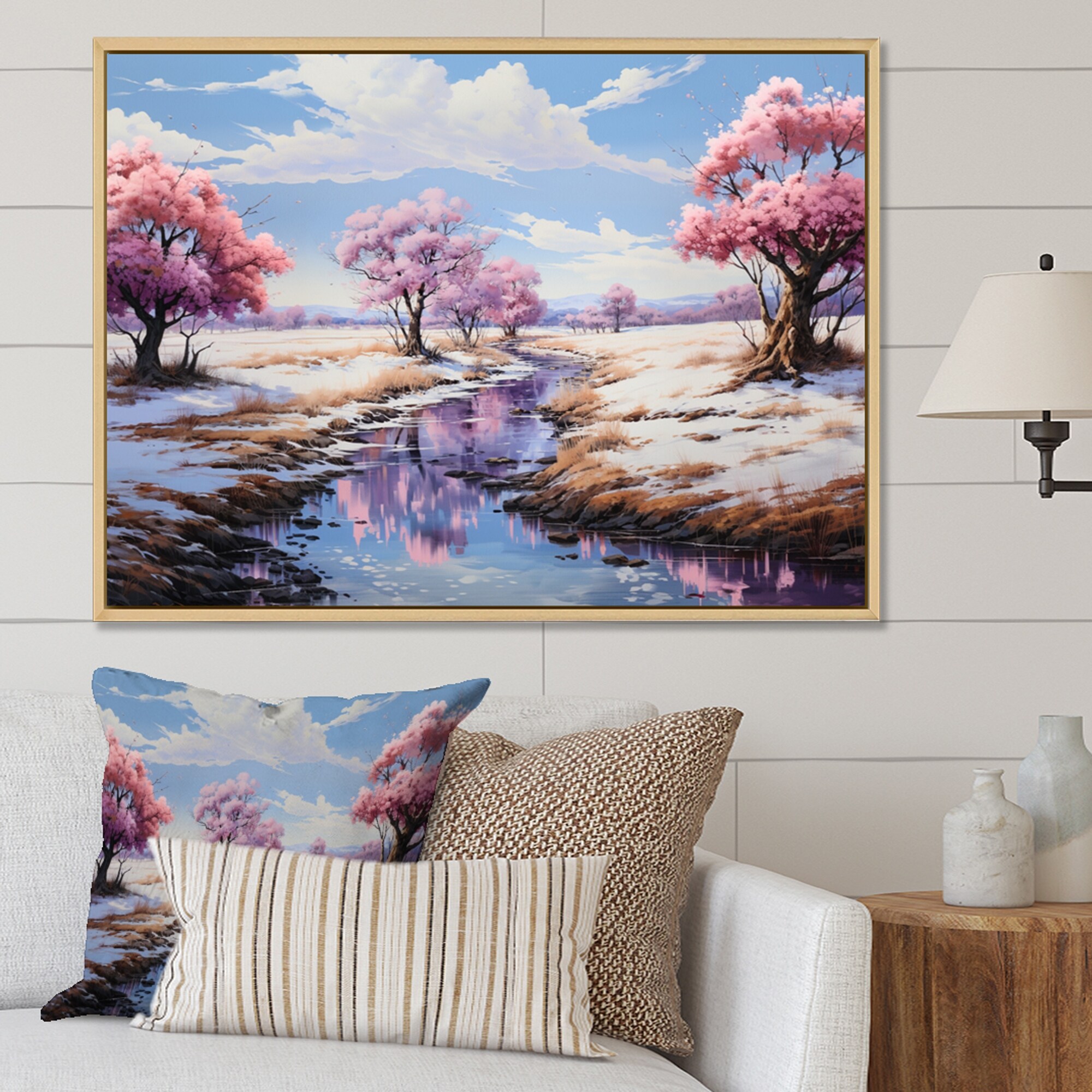 Designart "Pink Coral Riverside Serenity" Lakes & Rivers Framed Canvas Prints