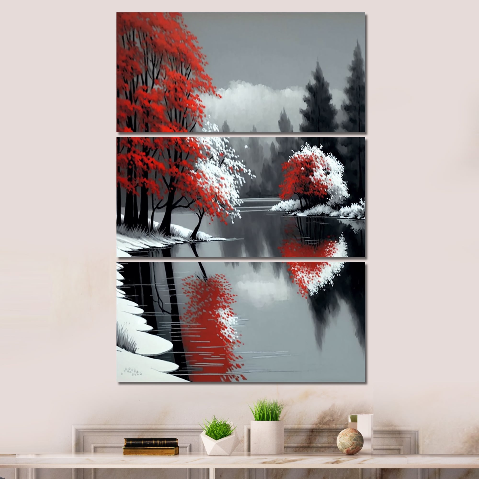 Designart "Snowy Red Trees By the Riverside" Cottage Lake Mountains Canvas Art Print - 3 Panels
