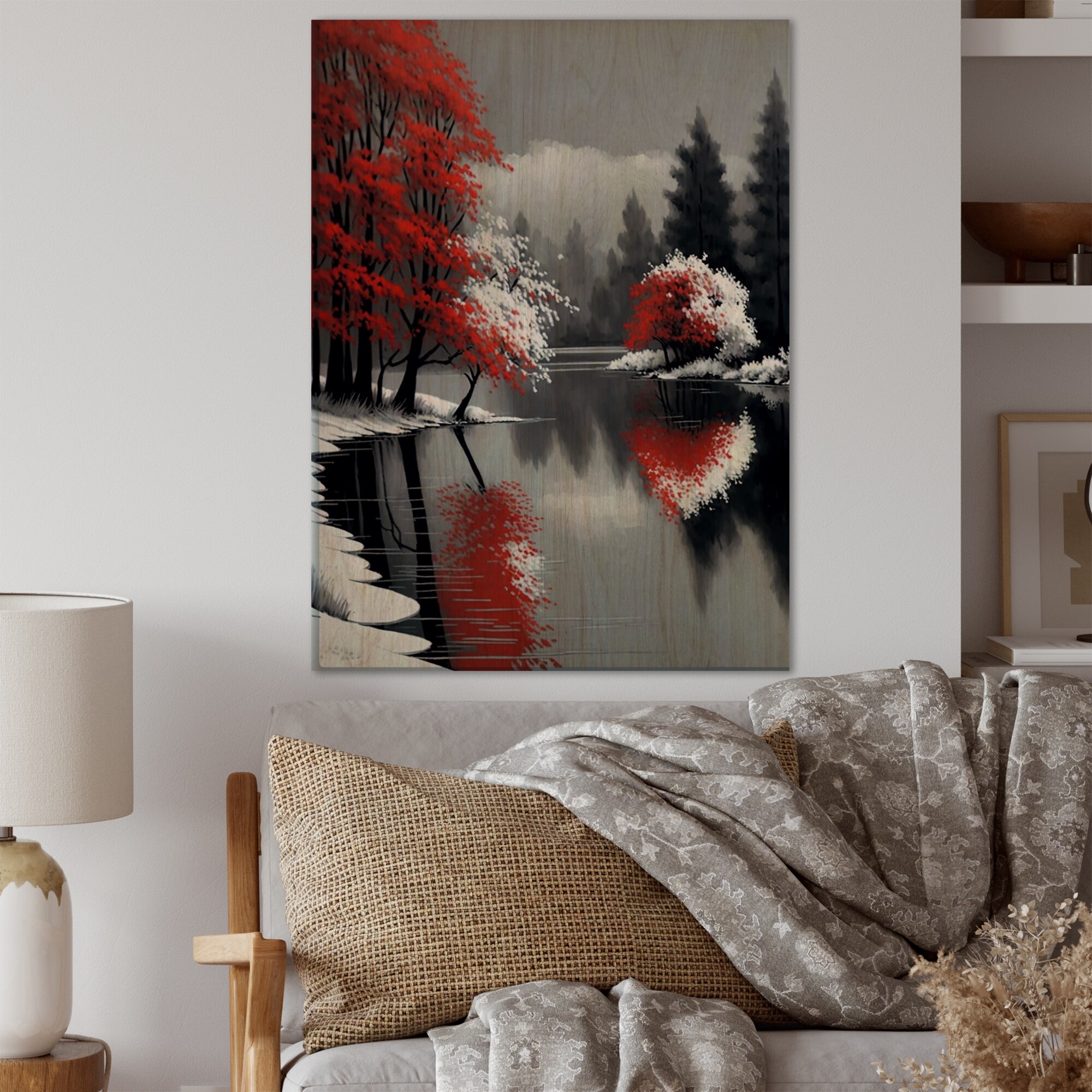 Designart 'Snowy Red Trees By the Riverside' Landscape Cottage Wood Wall Art - Natural Pine Wood