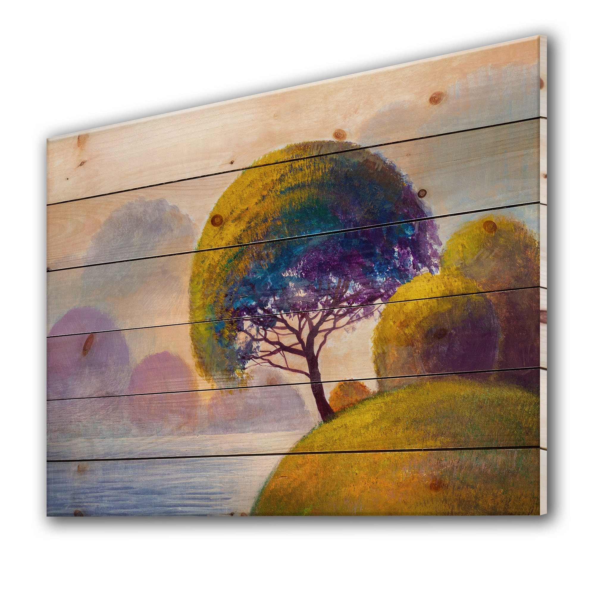 Designart 'Colorful Trees At Sunset By the Riverside I' Landscape Forest Wood Wall Art - Natural Pine Wood