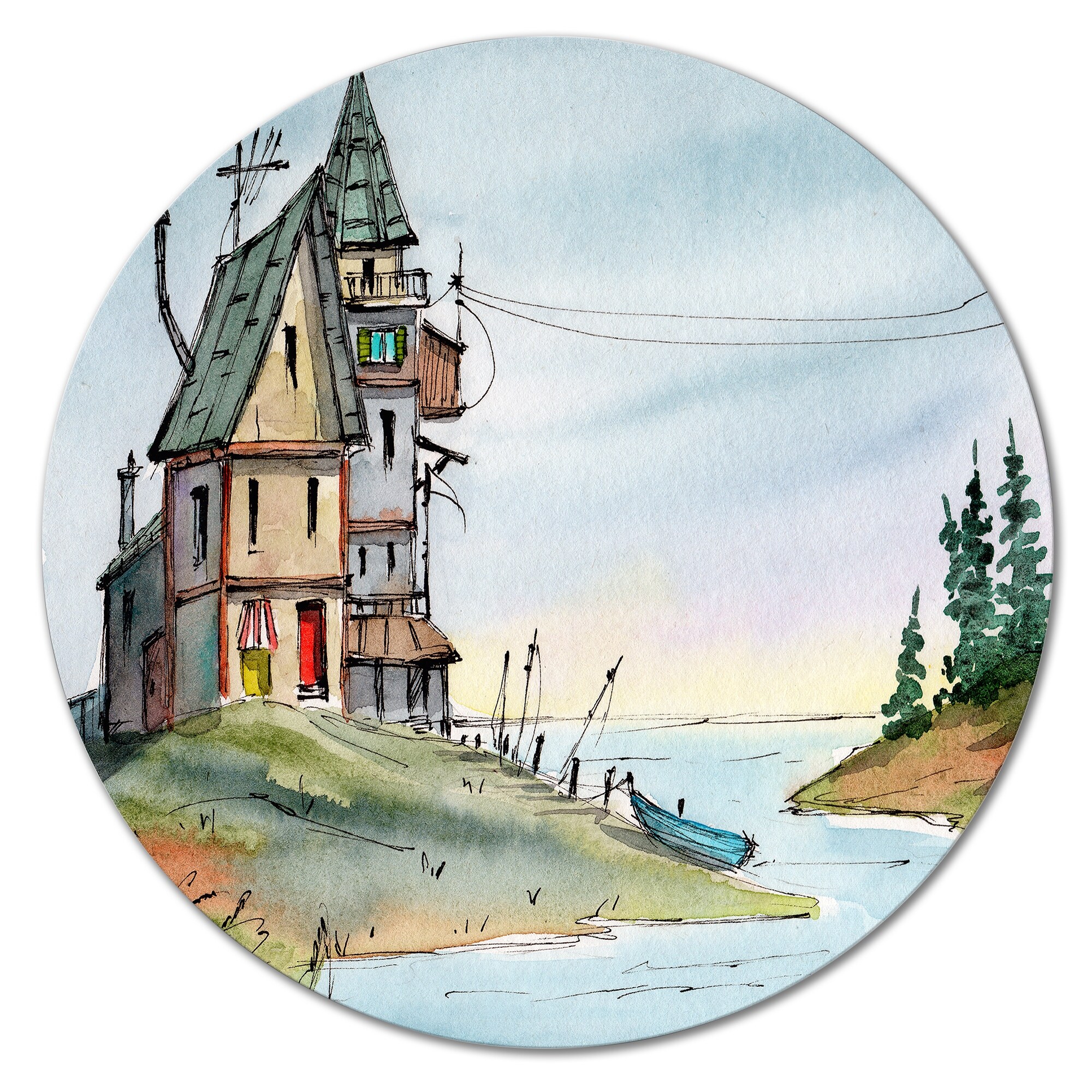 Designart 'Colorful Old House With A Tower By the Riverside' Nautical & Coastal Metal Circle Wall Art