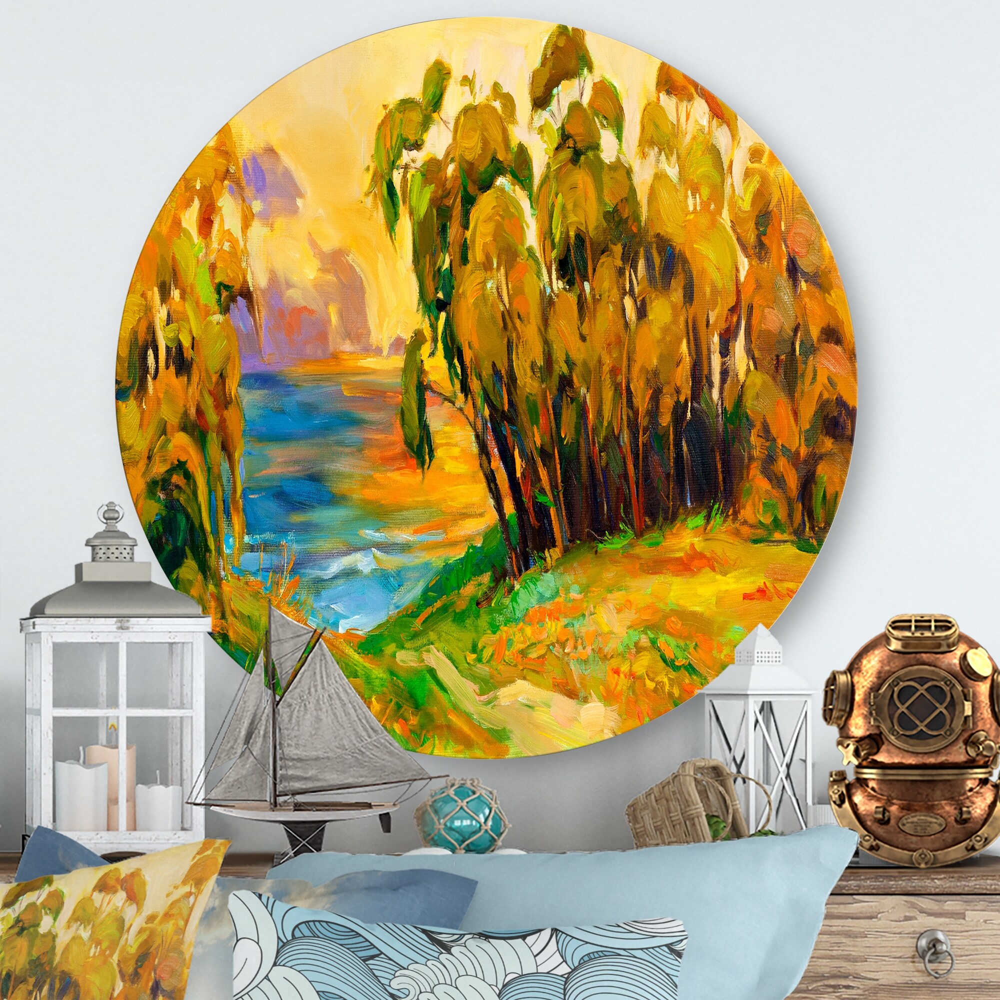 Designart 'Green Trees By the Riverside During Evenign Glow' Traditional Metal Circle Wall Art
