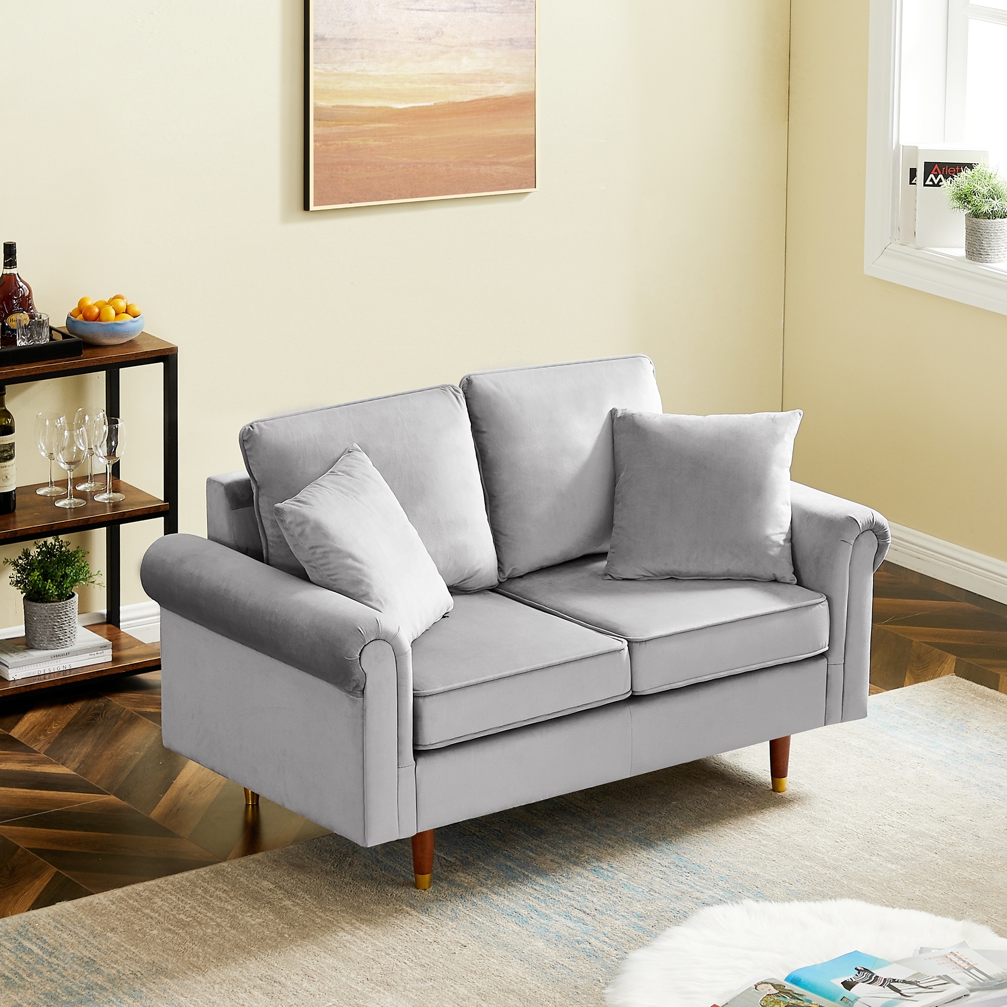 Velvet Sofa Couch with 2 Pillows, Modern Loveseat Sofa With 4 Solid Rubber Wood Legs for Living Room and Bedroom