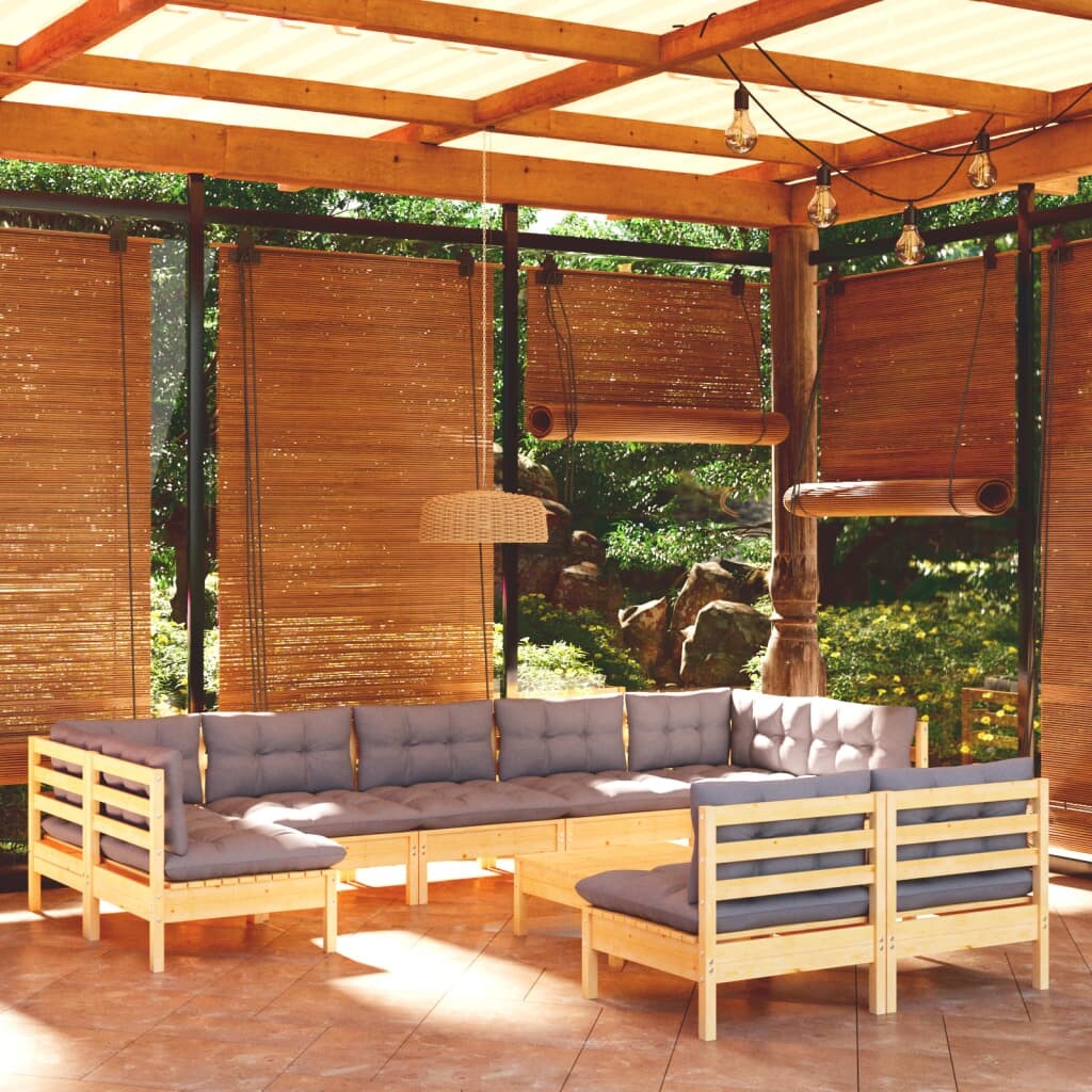 vidaXL 10 Piece Patio Lounge Set with Gray Cushions Solid Pinewood