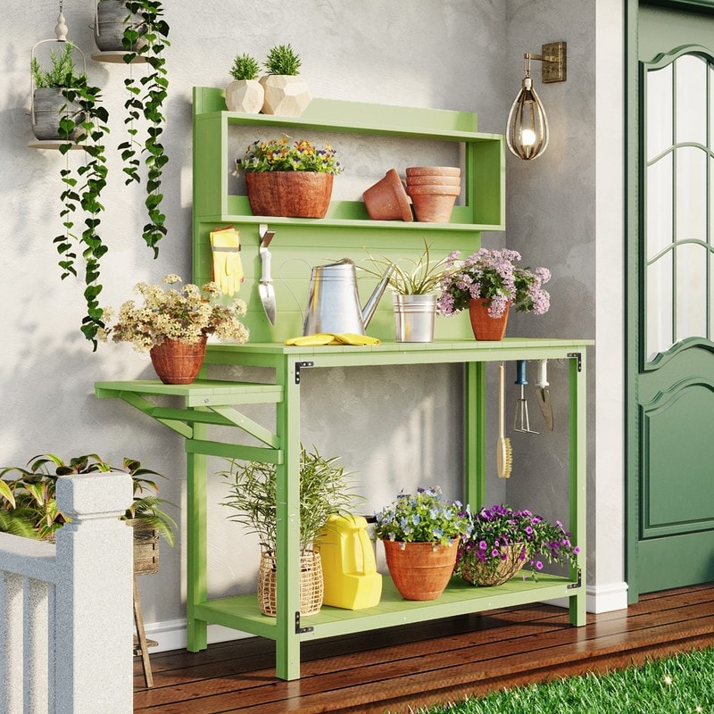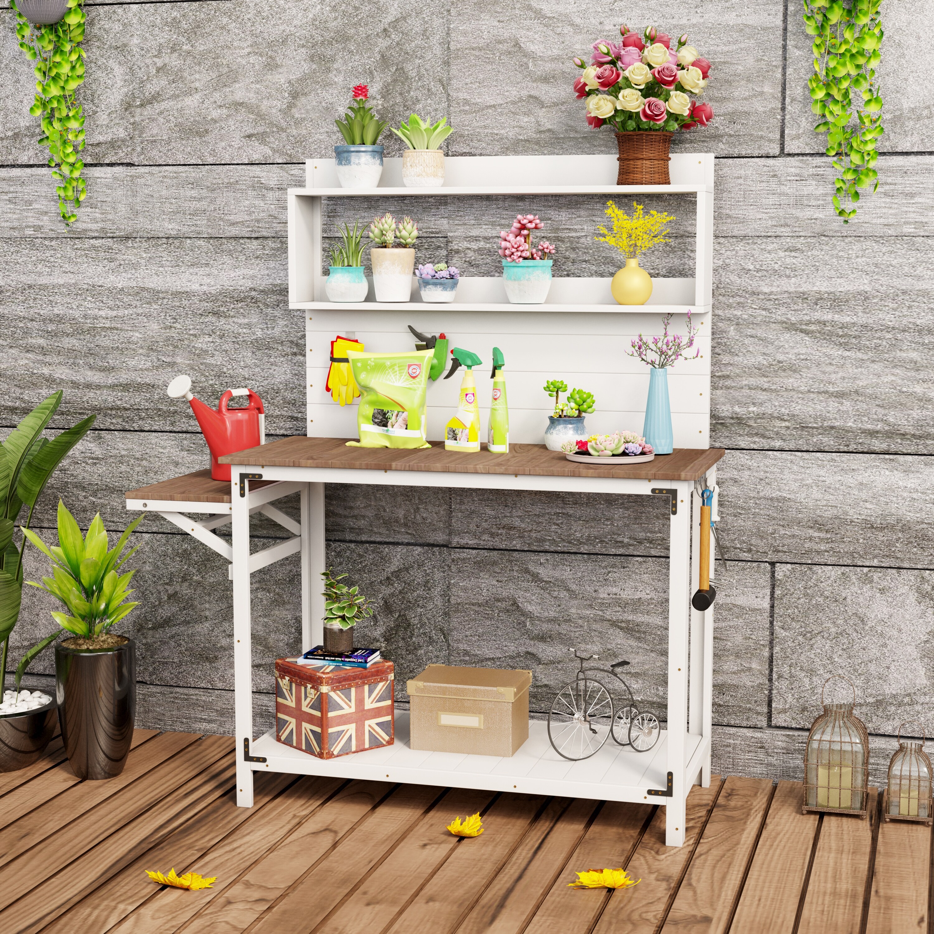 Garden Wood Workstation Backyard Potting Bench Table with Side Hook and Foldable Side Table