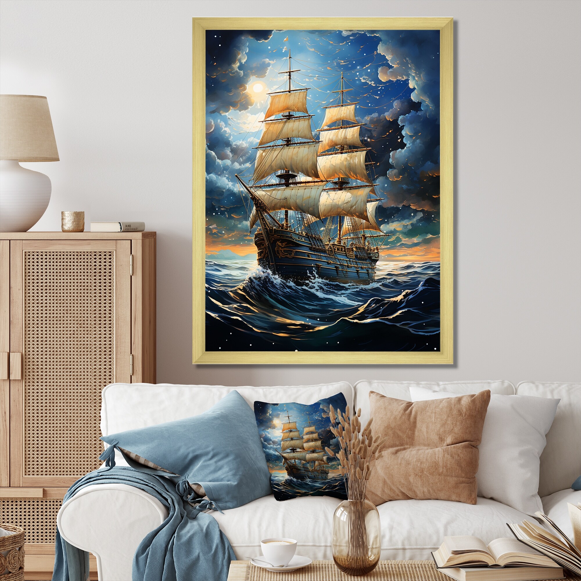 Designart "Pirate Boat Silent Nightfall" Pirate Framed Canvas Art Print