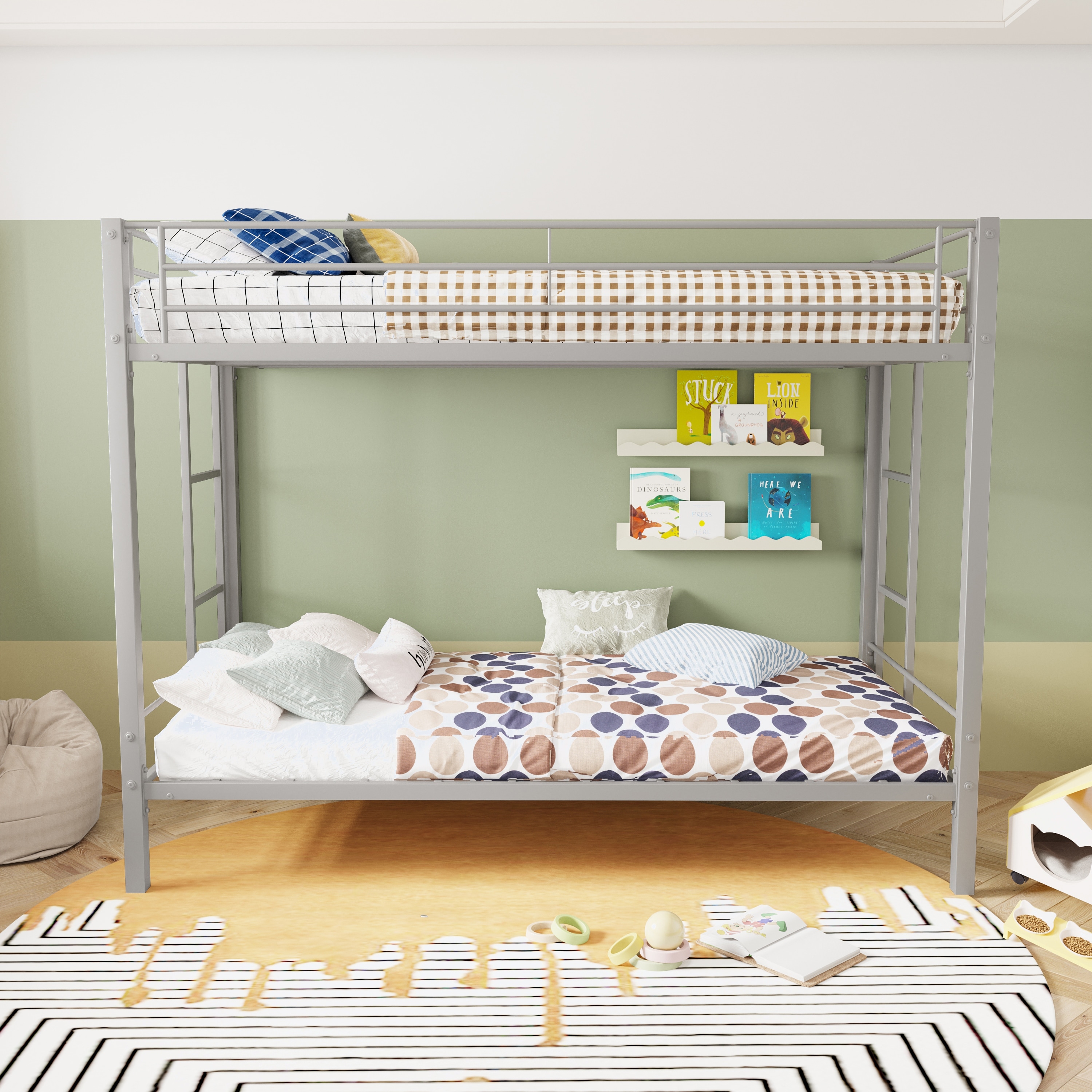 Modern Metal Bunk Bed Twin Over Twin With Shelf And Slatted Support