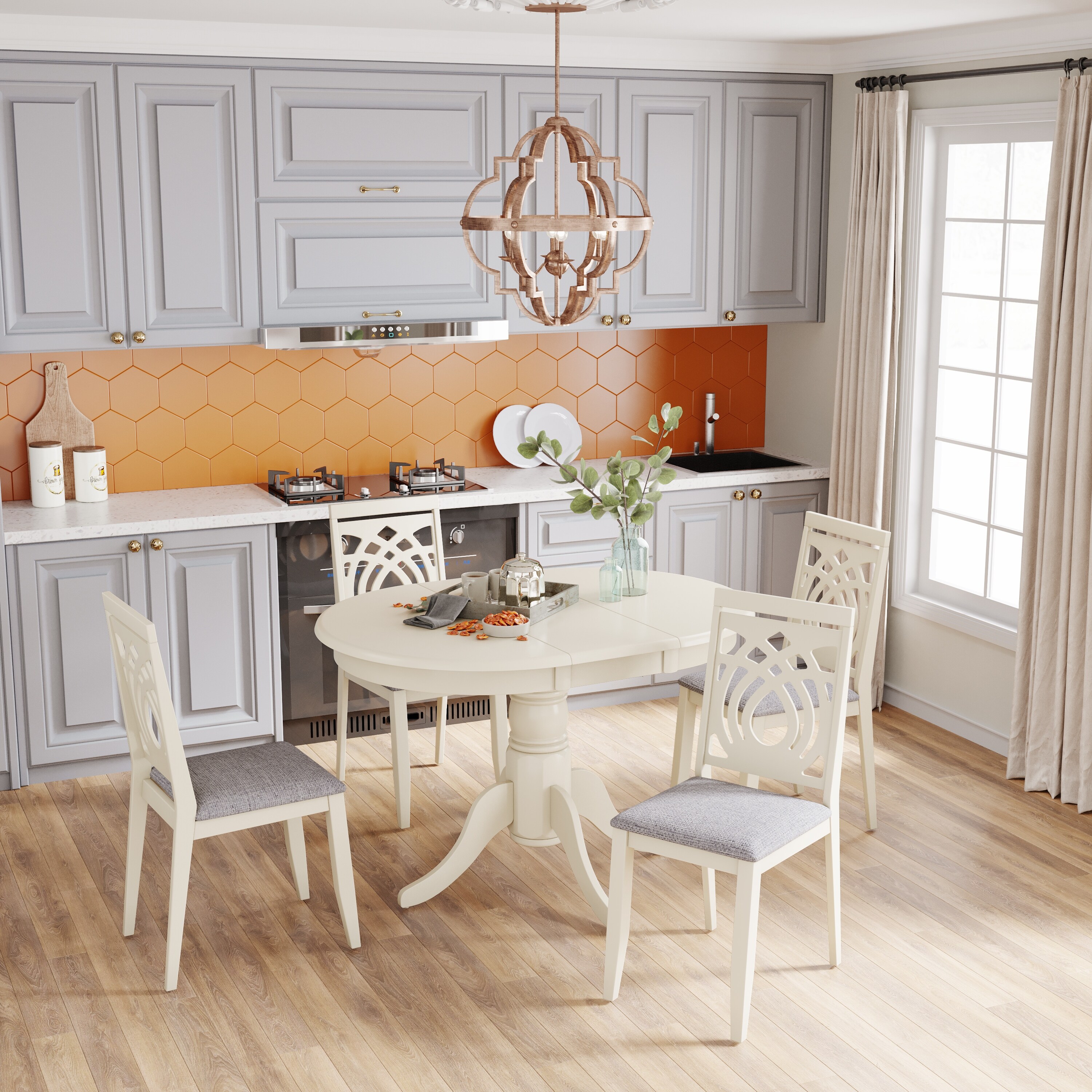 Farmhouse 5-Piece Wood Extendable Dining Table Set with Drop Leaf and 4 Upholstered Dining Chairs for Small Places