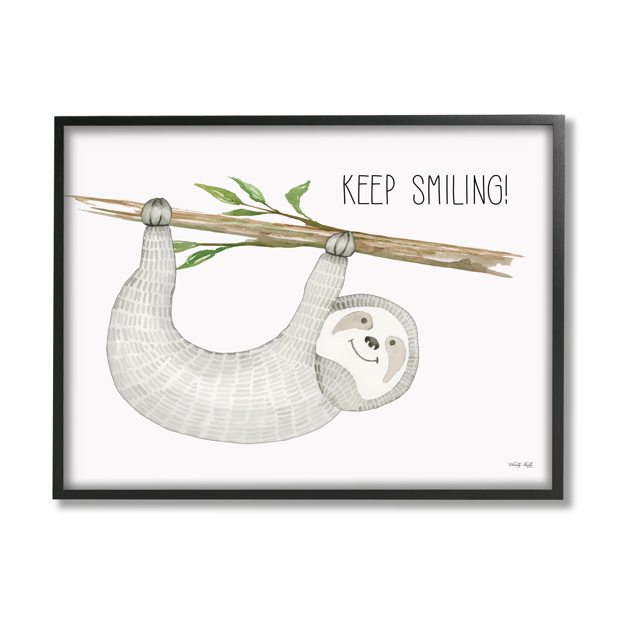 Stupell Industries Keep Smiling Hanging Sloth from Branch Kid's Cartoon Framed Wall Art, Design by Cindy Jacobs - Grey