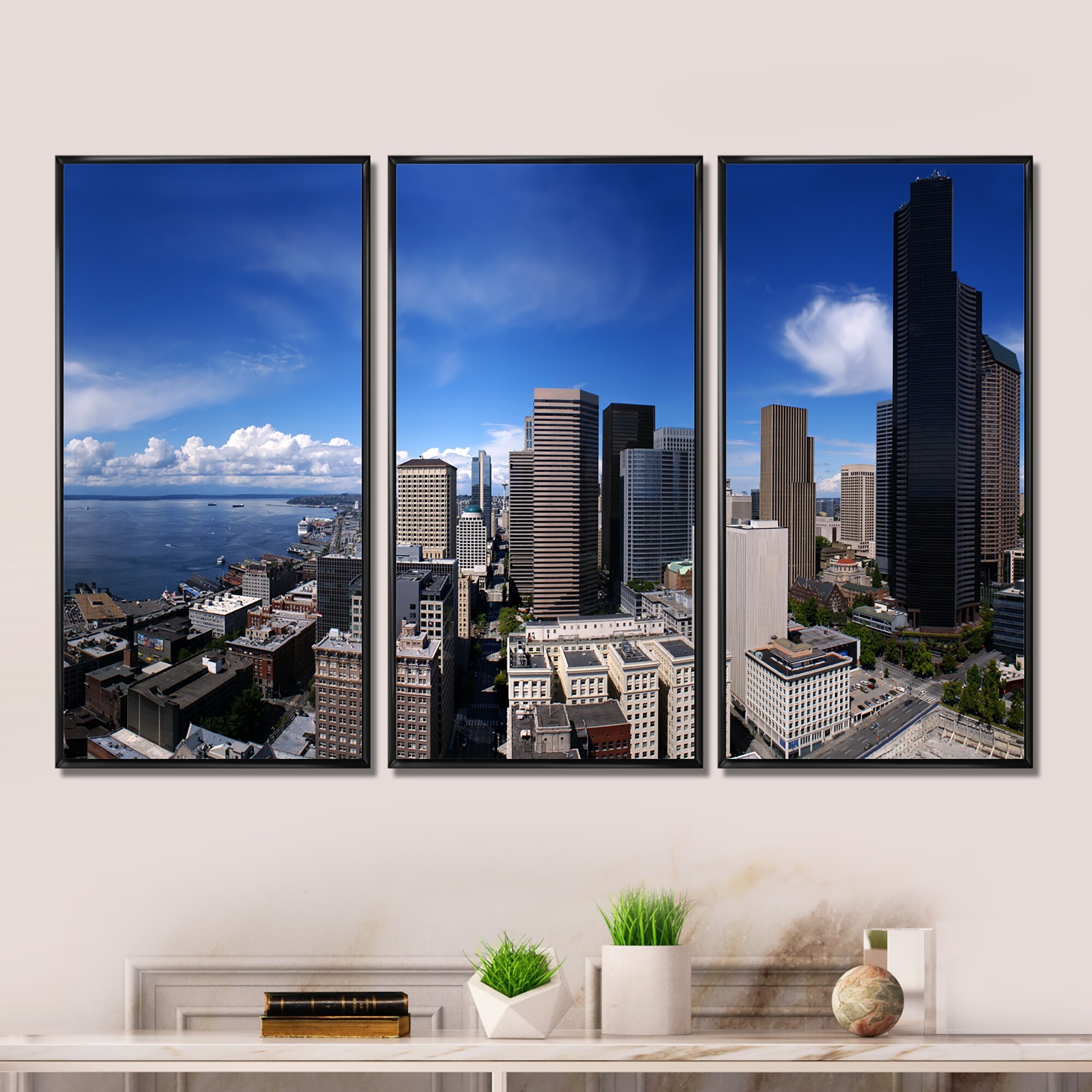 Designart "Seattle Downtown from Smith Tower" Cityscape Framed Canvas Wall Art Set of 3 - 4 Colors of Frames