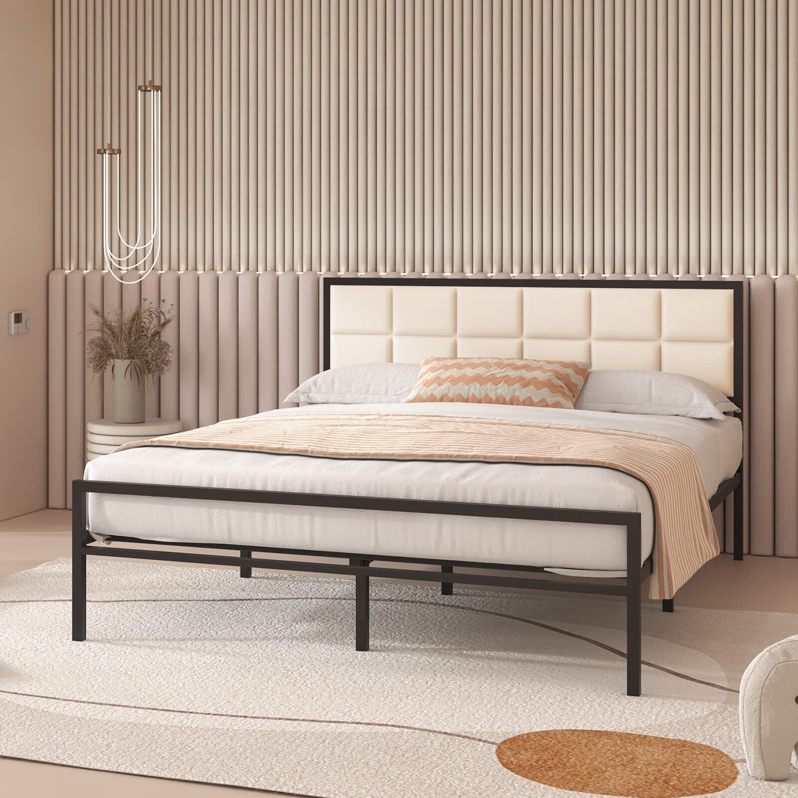 Faux Leather Platform Bed Frame with Upholstered Square Stitched Headboard