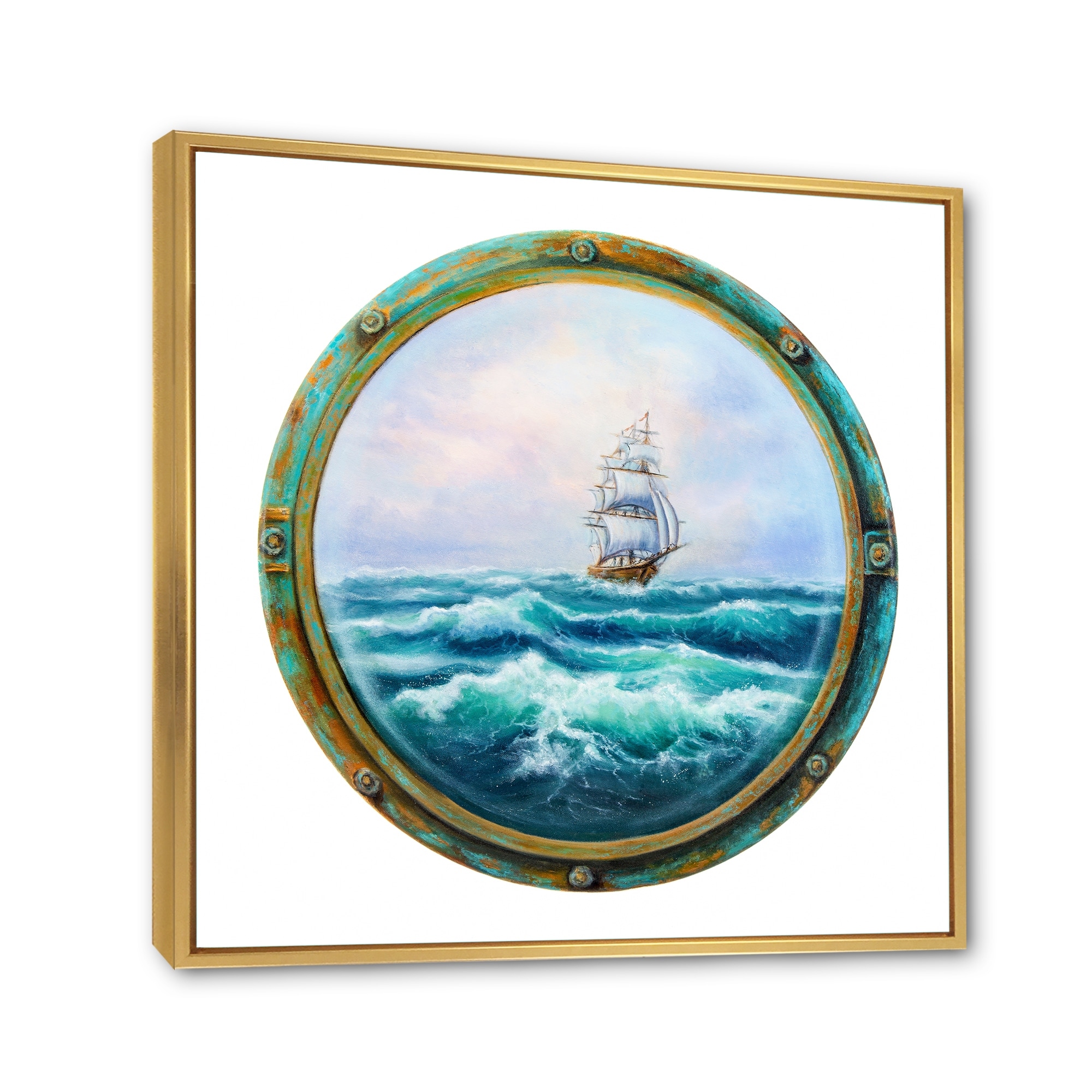 Designart "Cabin Window Showing Ship in Stormy Ocean" Nautical & Coastal Framed Canvas Wall Art Print