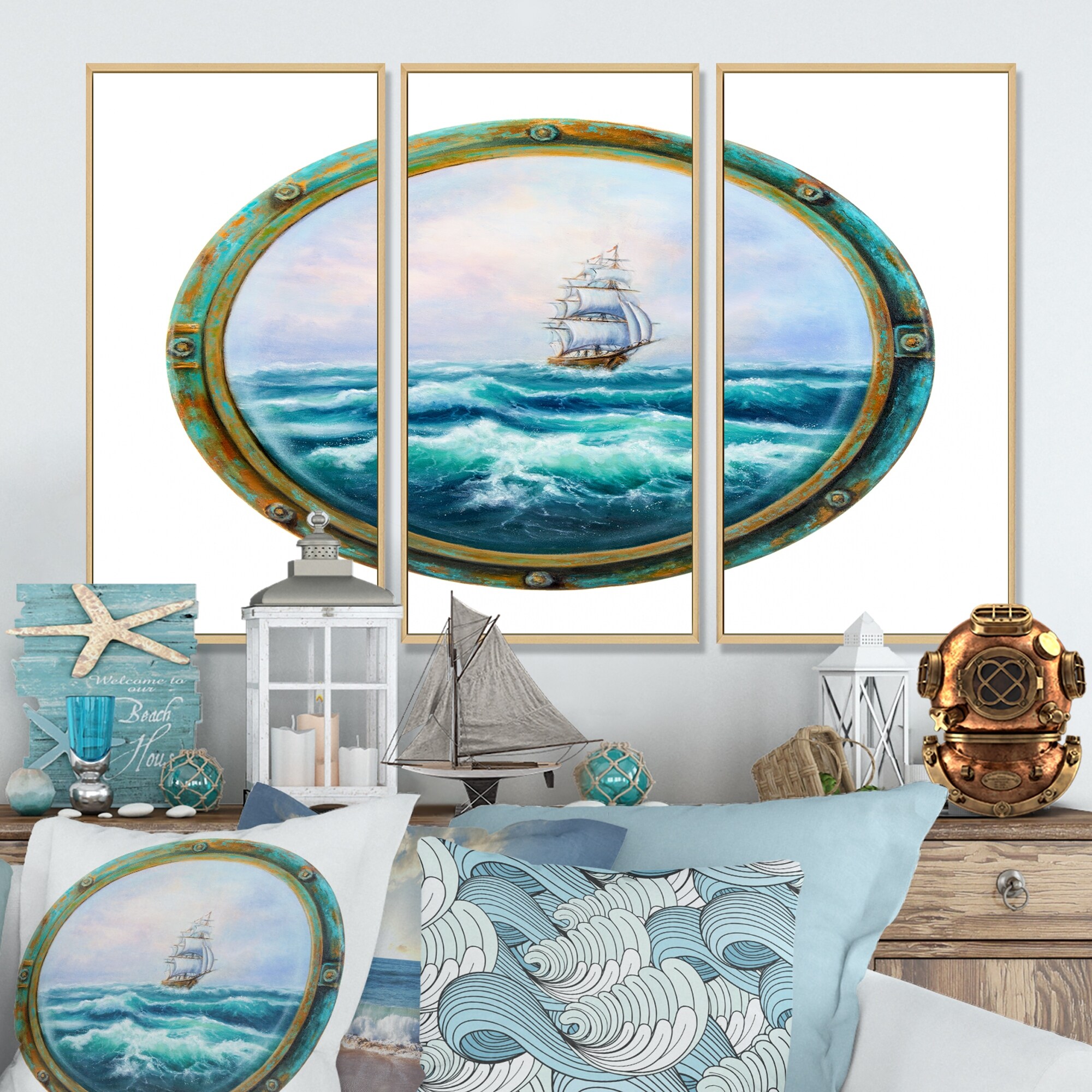Designart "Cabin Window Showing Ship in Stormy Ocean" Nautical & Coastal Framed Art Set of 3 - 4 Colors of Frames