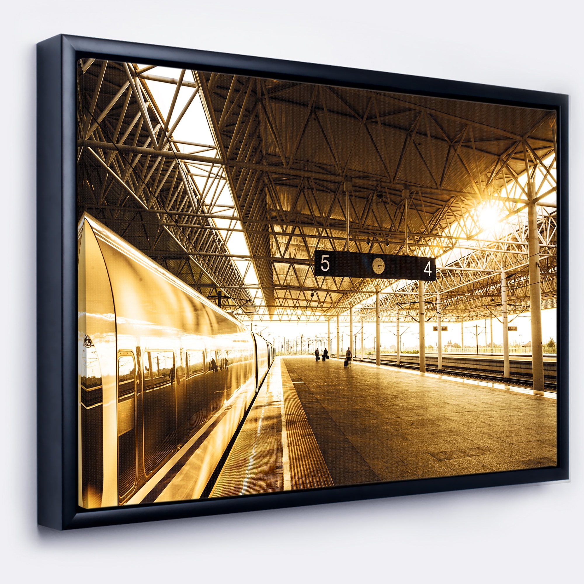 Designart "Train at Railway Station with Sunlight" Landscape Framed Canvas Art Print