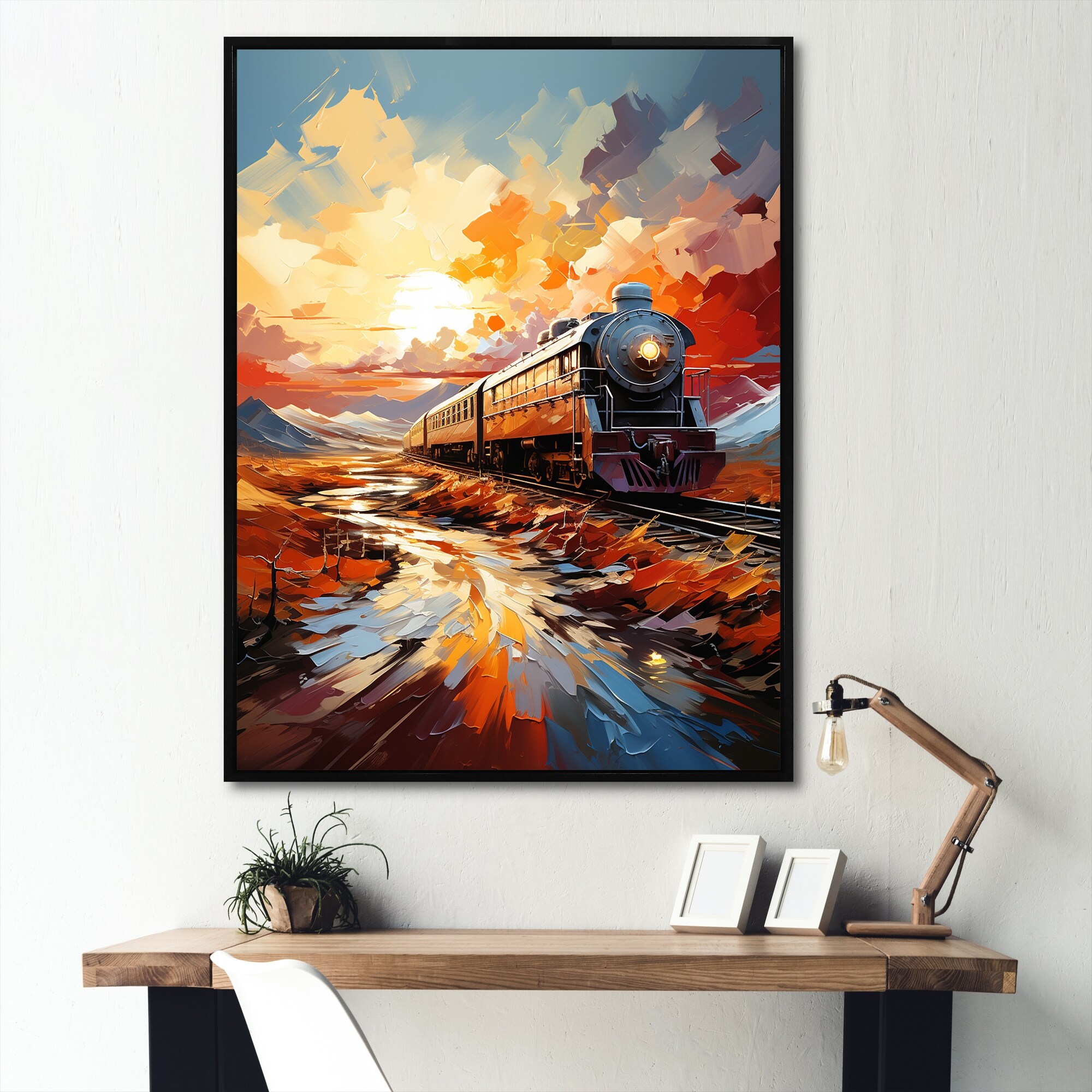 Designart "Orange Train Sublime Landscapes" Train Framed Wall Decor