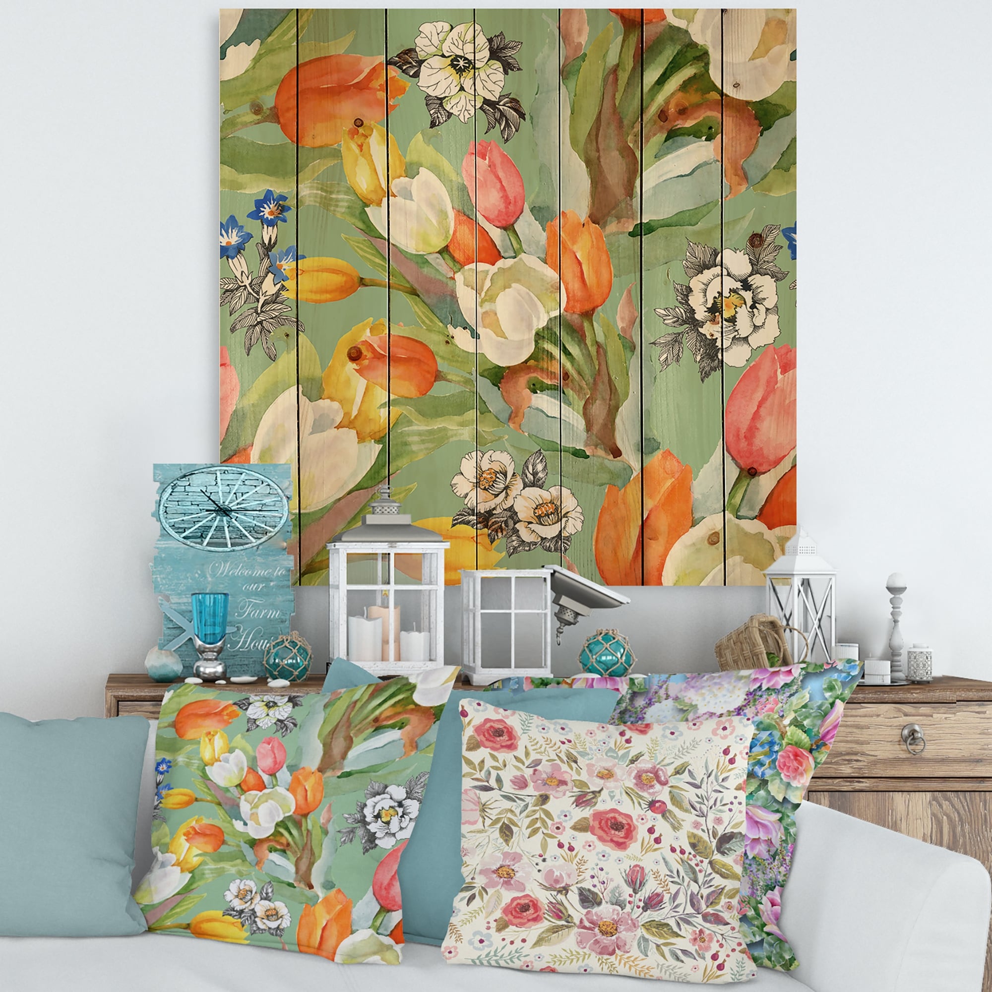 Designart 'Colorful Tulip I' Floral Tulip Wood Wall Art - Natural Pine Wood
