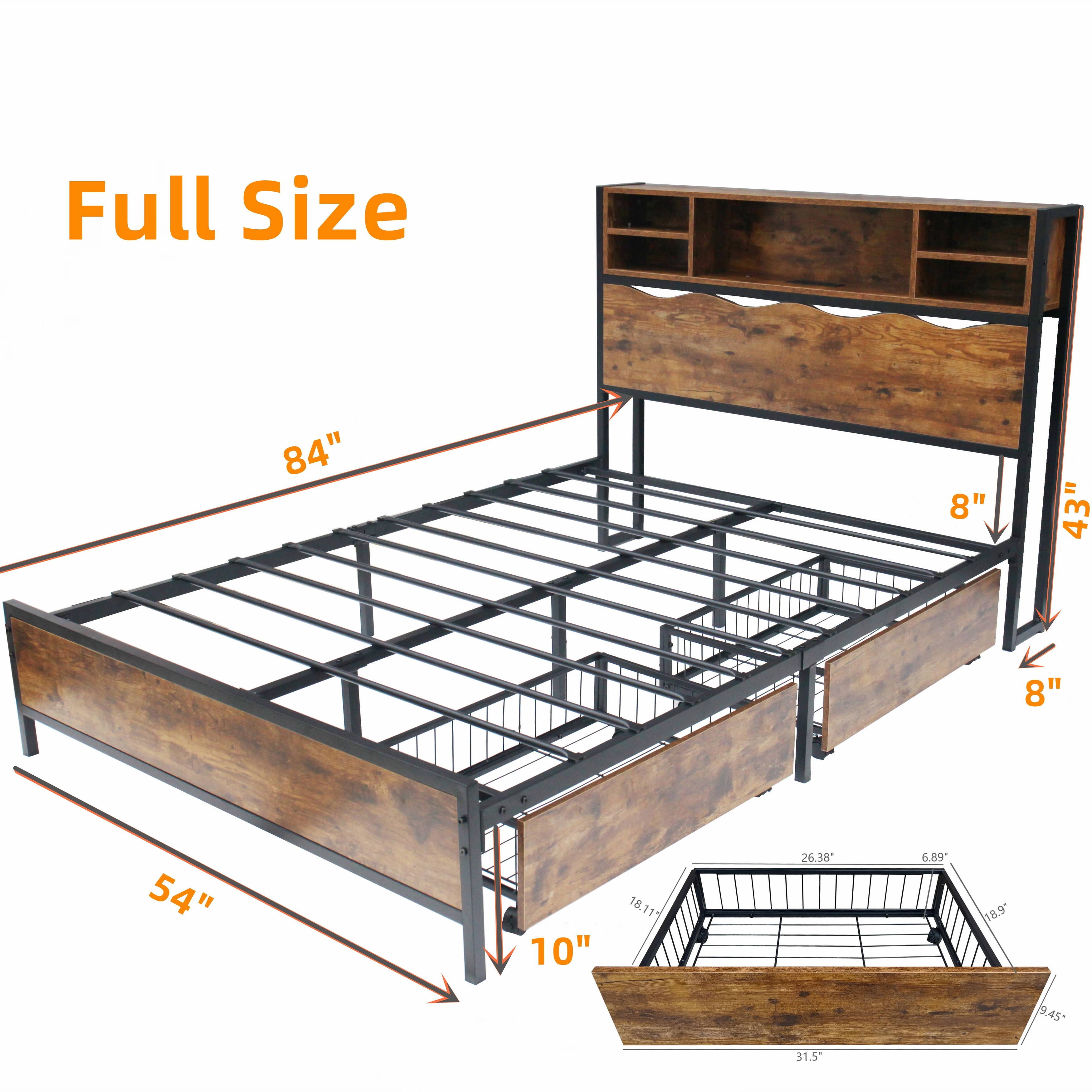 Rustic Metal Platform Bed with 2 Drawers, Sockets & USB Ports, Metal & Wood Bed Frame with Storage Headboard, No Box Spring Need