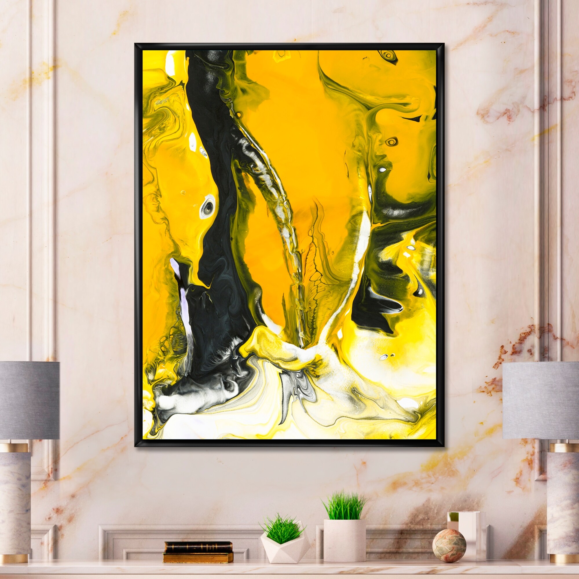 Designart "Yellow Black And White Liquid Art VII" Modern Framed Canvas Wall Art Print