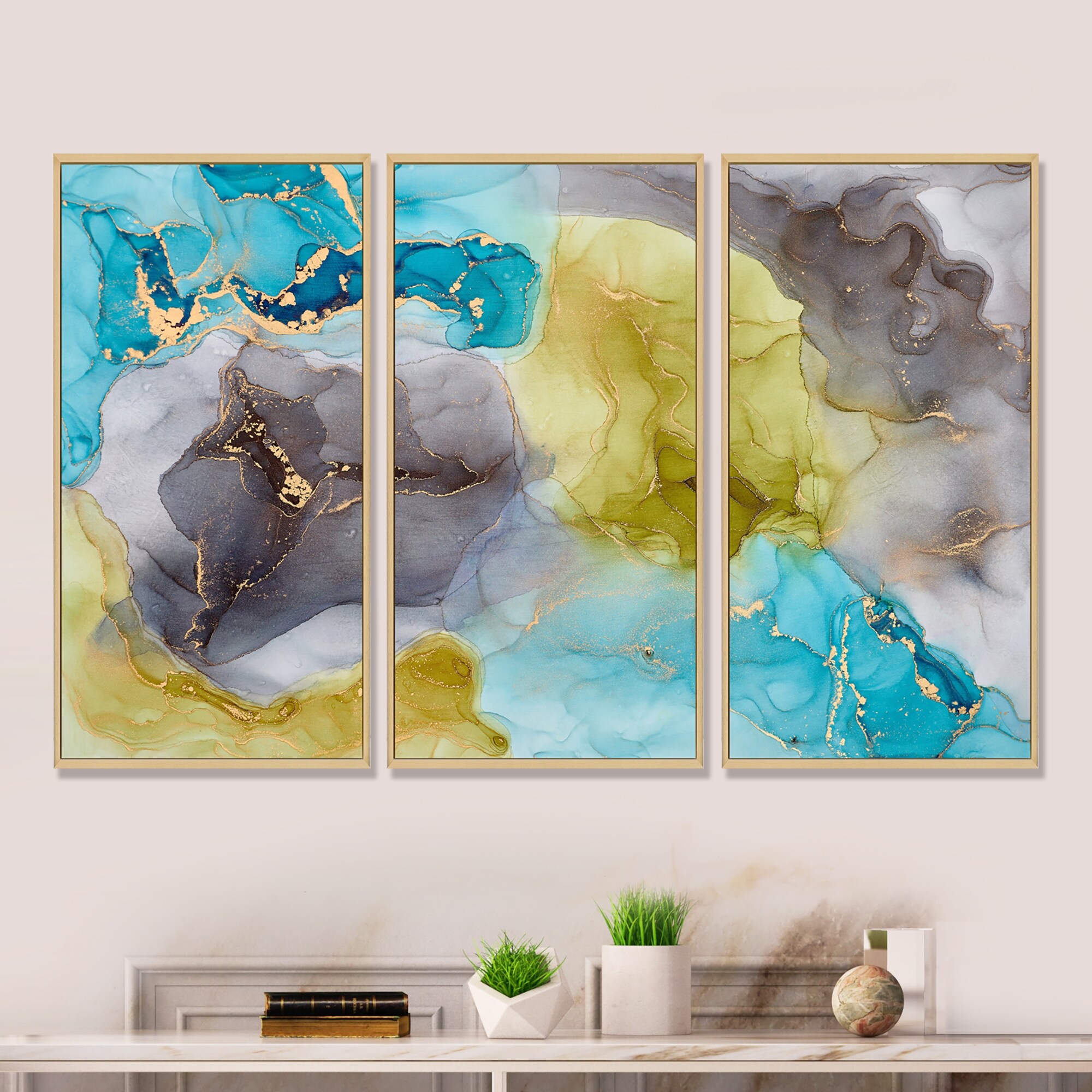 Designart "Blue Luxury Abstract Fluid Art VII" Modern Framed Canvas Wall Art Set of 3 - 4 Colors of Frames