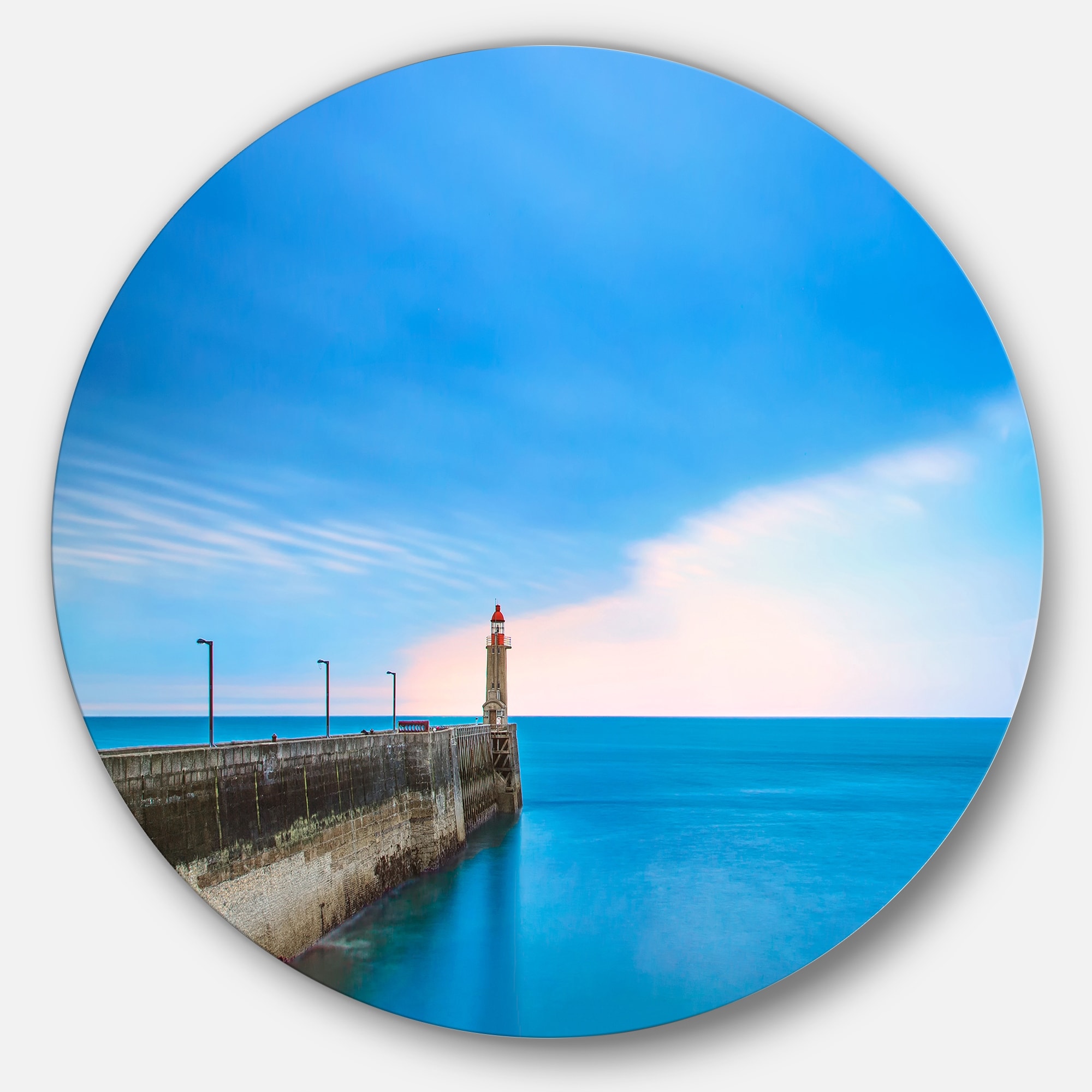 Designart 'Pier and Lightour in Sunset' Seascape Photo Round Wall Art
