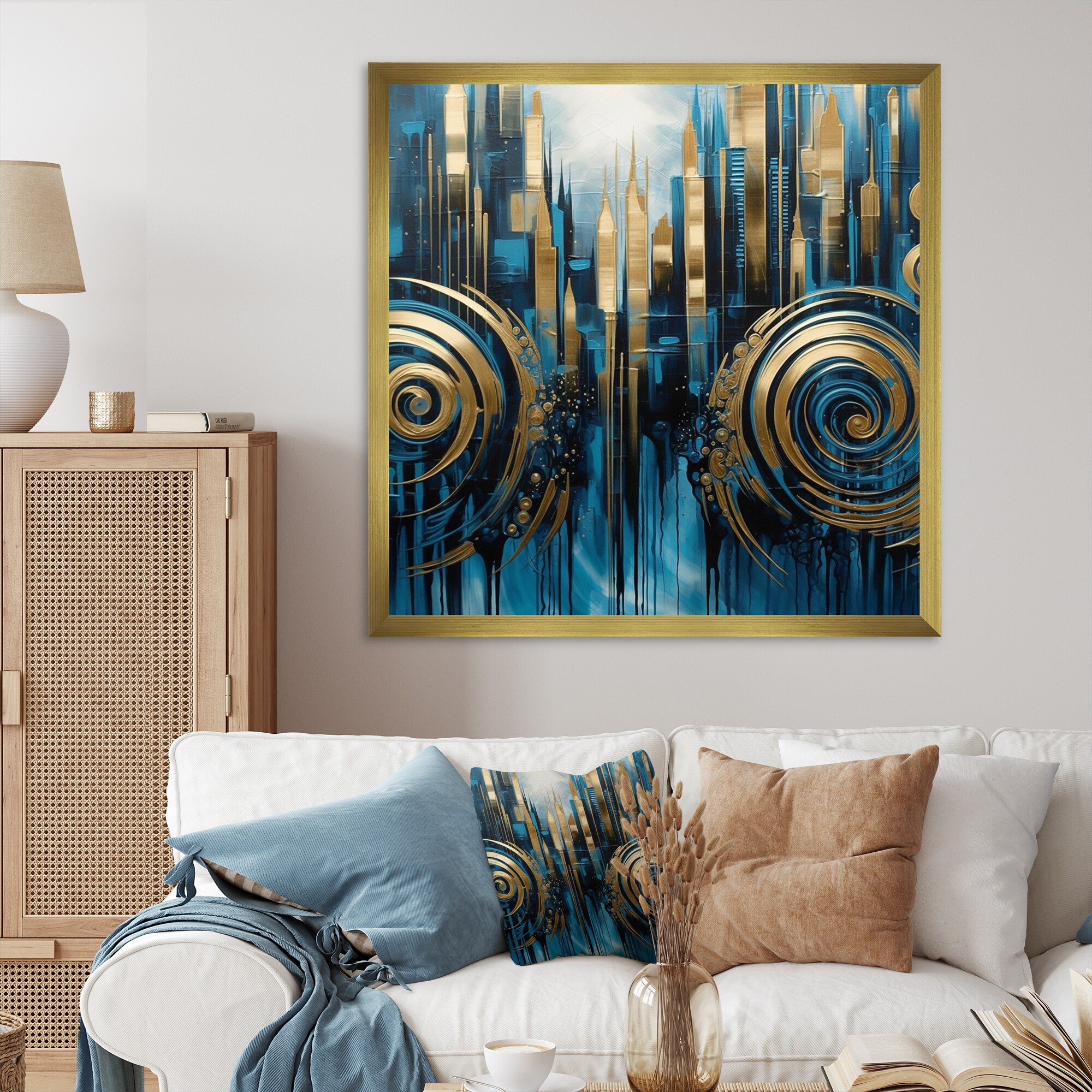 Designart "Gold And Blue Urban Elegance Ii" City Art Deco Framed Wall Art for Living Room