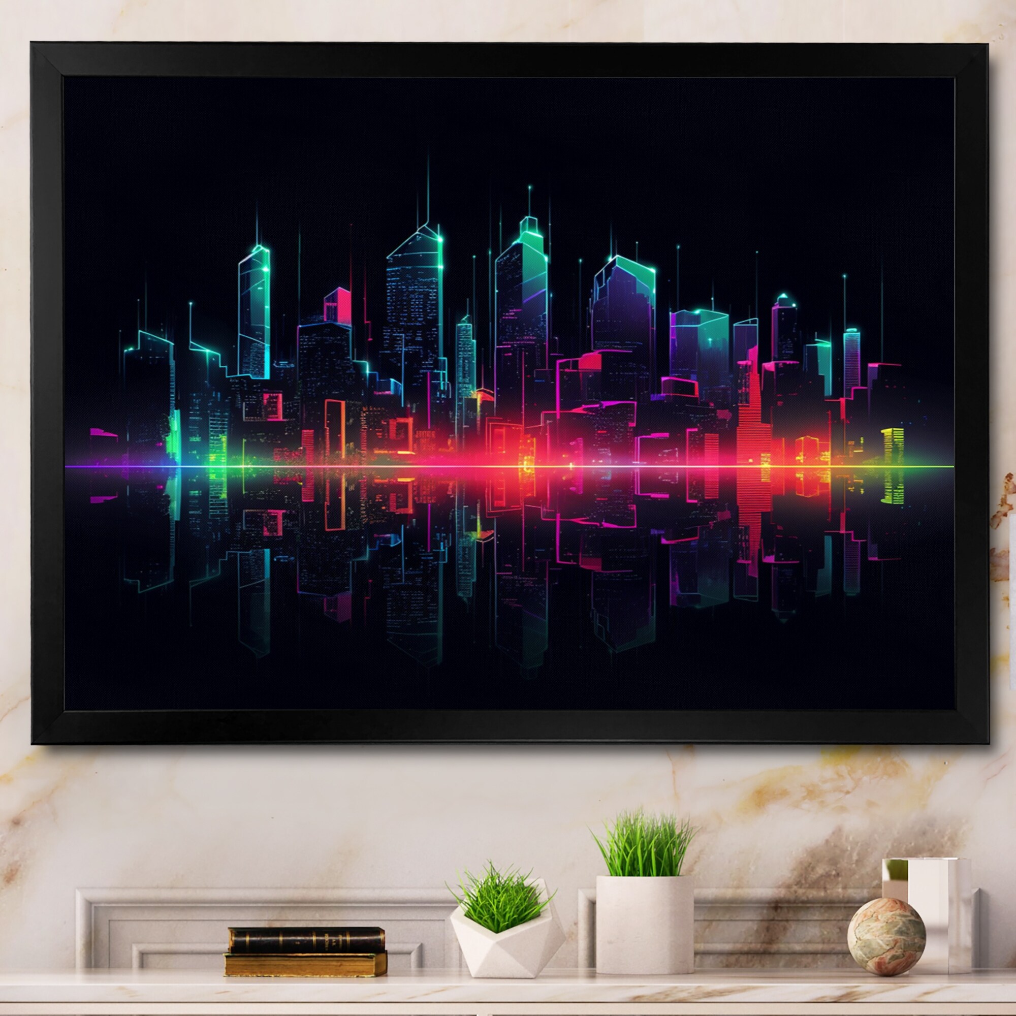 Designart "Pink And Green Deco Horizons Ii" City Art Deco Framed Wall Art Prints