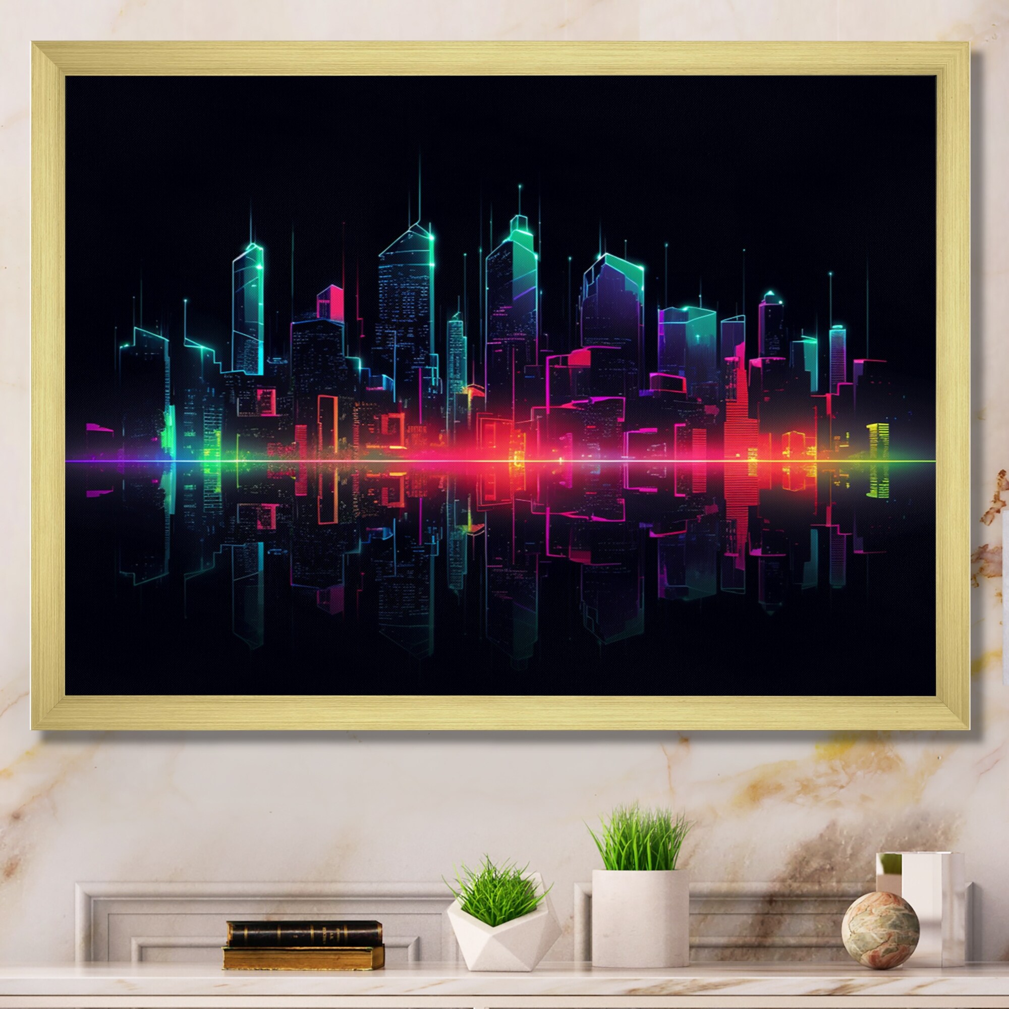 Designart "Green And Pink Brooklyn At Sunset" City Art Deco Framed Wall Art Prints