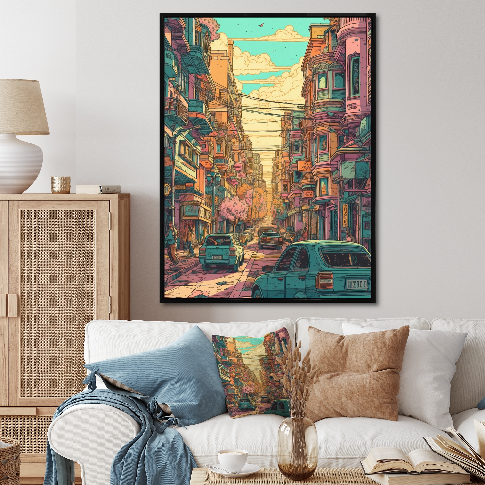 Designart "Pink And Green Cityscapes in Vivid Expression I" City Art Deco Framed Canvas Wall Art