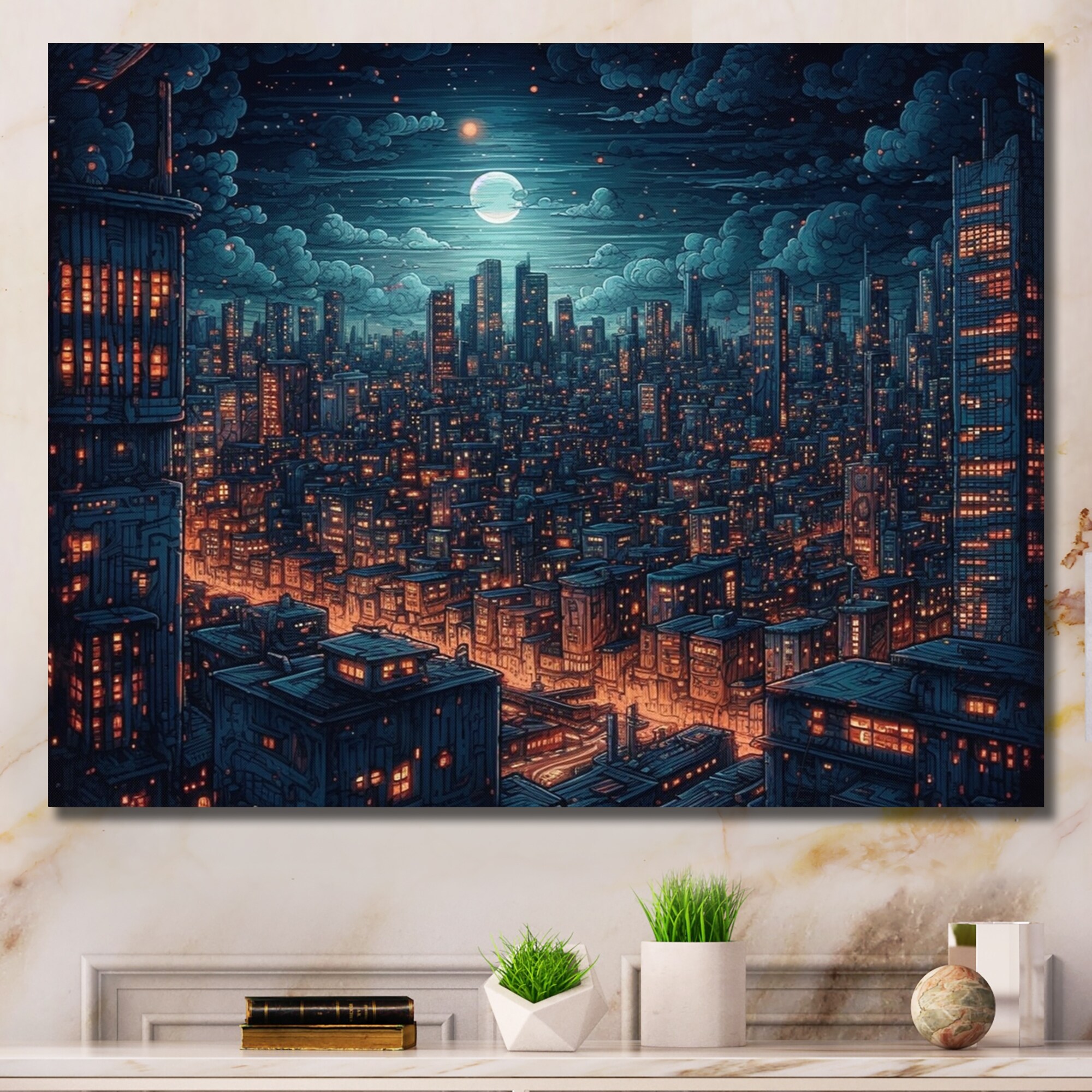 Designart "Blue And Yellow Drama of a Stormy Night City I" City Art Deco Framed Canvas Wall Art