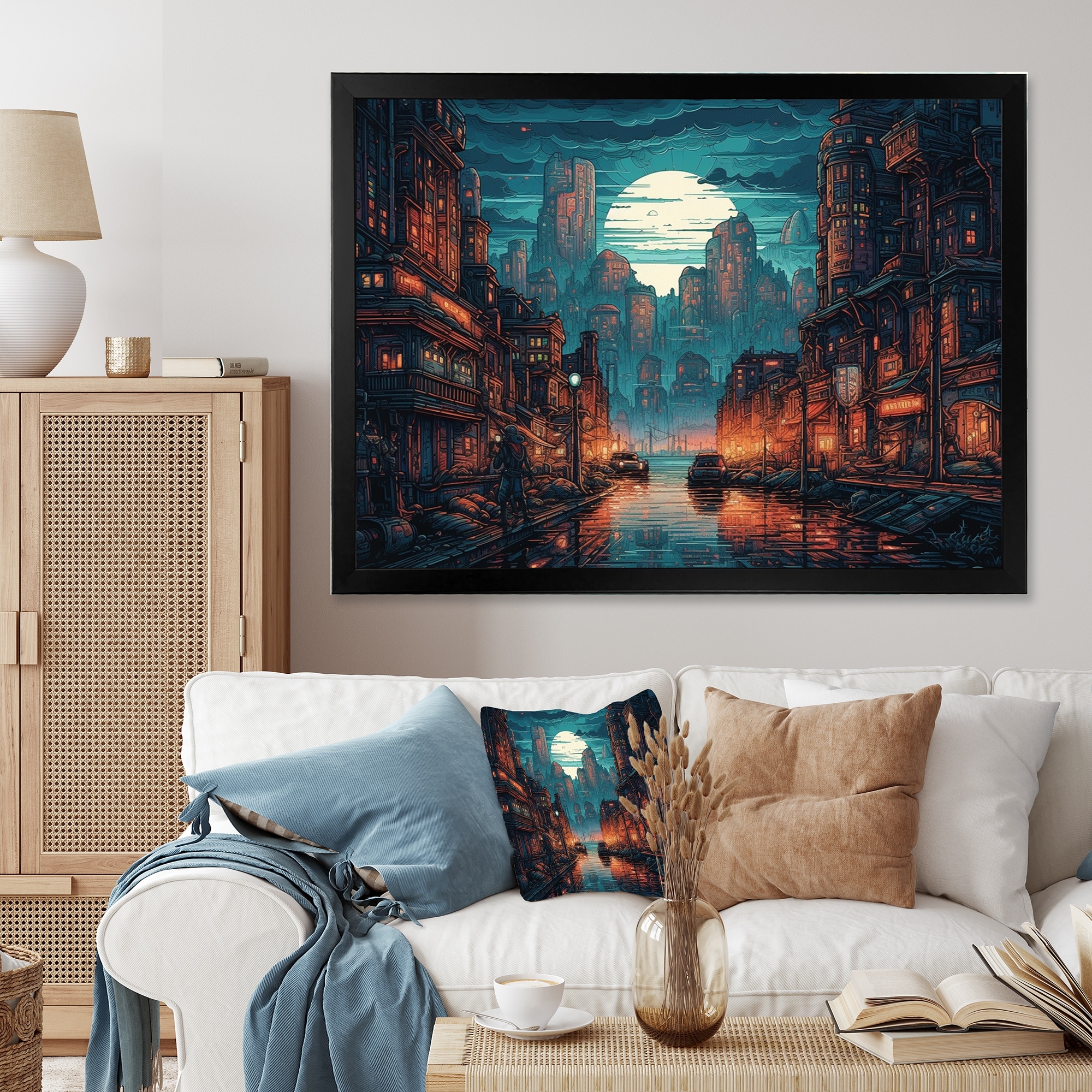 Designart "Blue And Orange Retro Cityscape I" City Art Deco Framed Canvas Wall Art