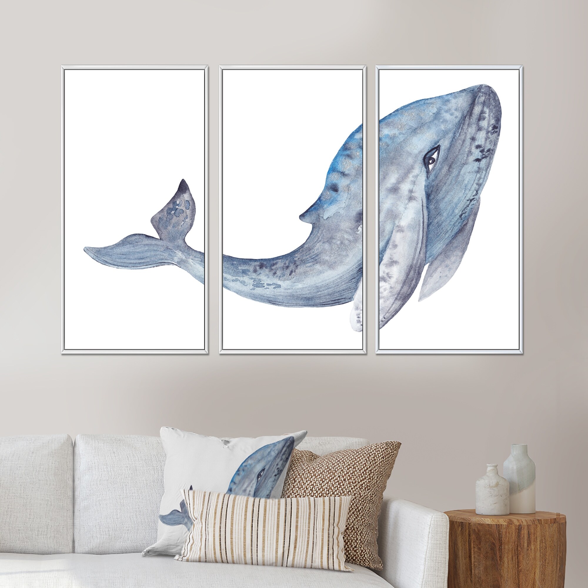 Designart "Large Whale Watercolor" Animal Framed Canvas Wall Art Set of 3 - 4 Colors of Frames