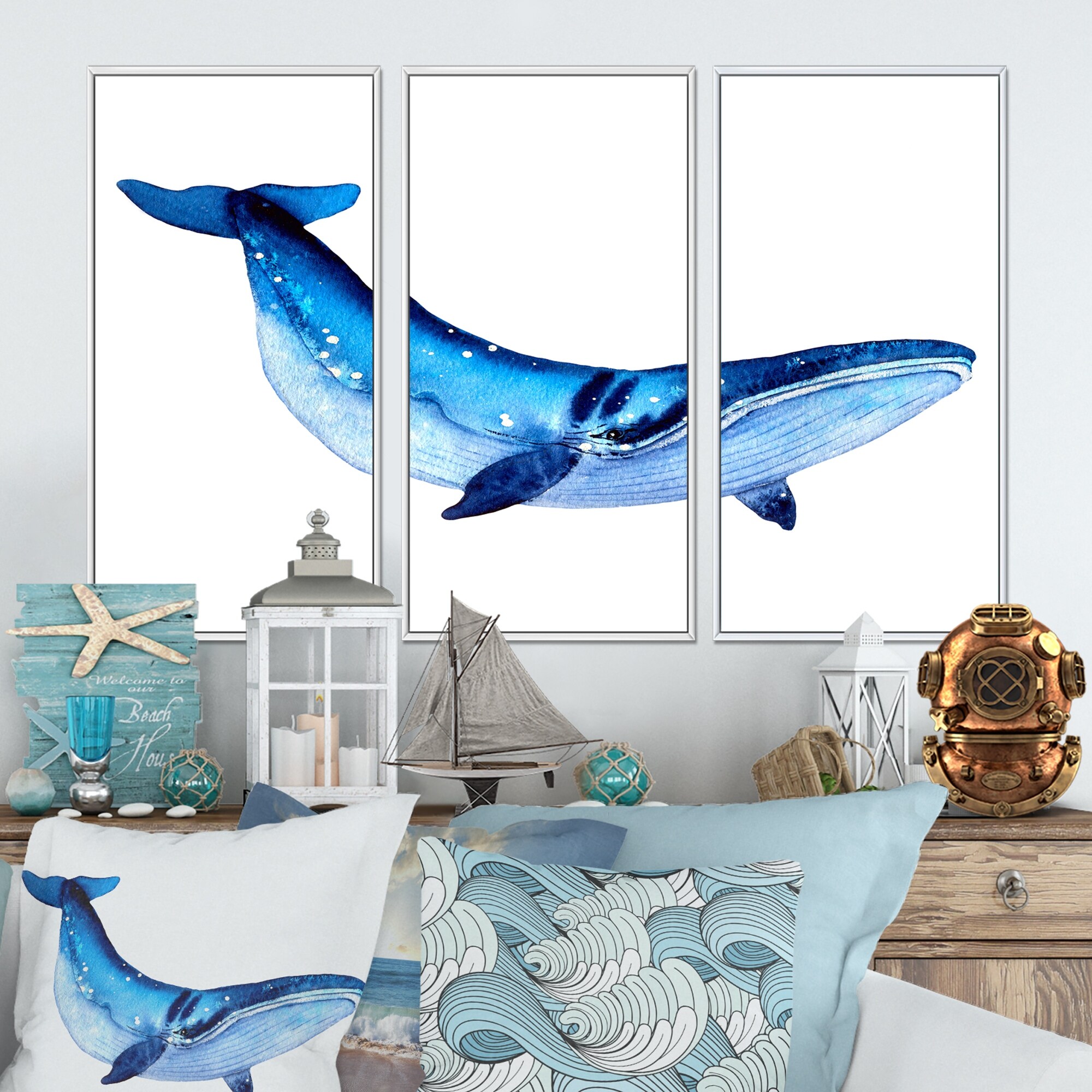 Designart "Blue Whale on White I" Nautical & Coastal Framed Art Prints Set of 3 - 4 Colors of Frames