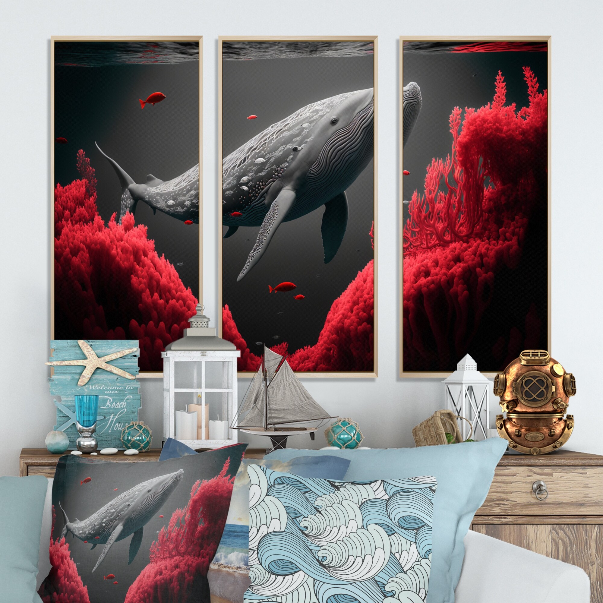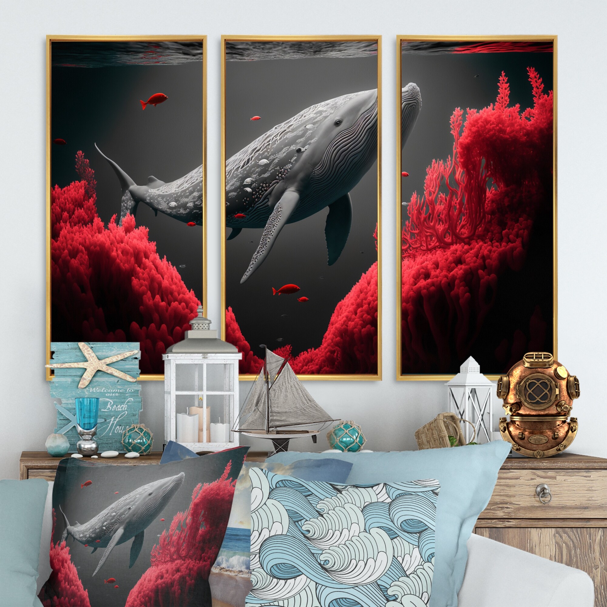 Designart "Whale In Red And Gray" Animal Whale Framed Canvas Wall Art Print - 3 Panels