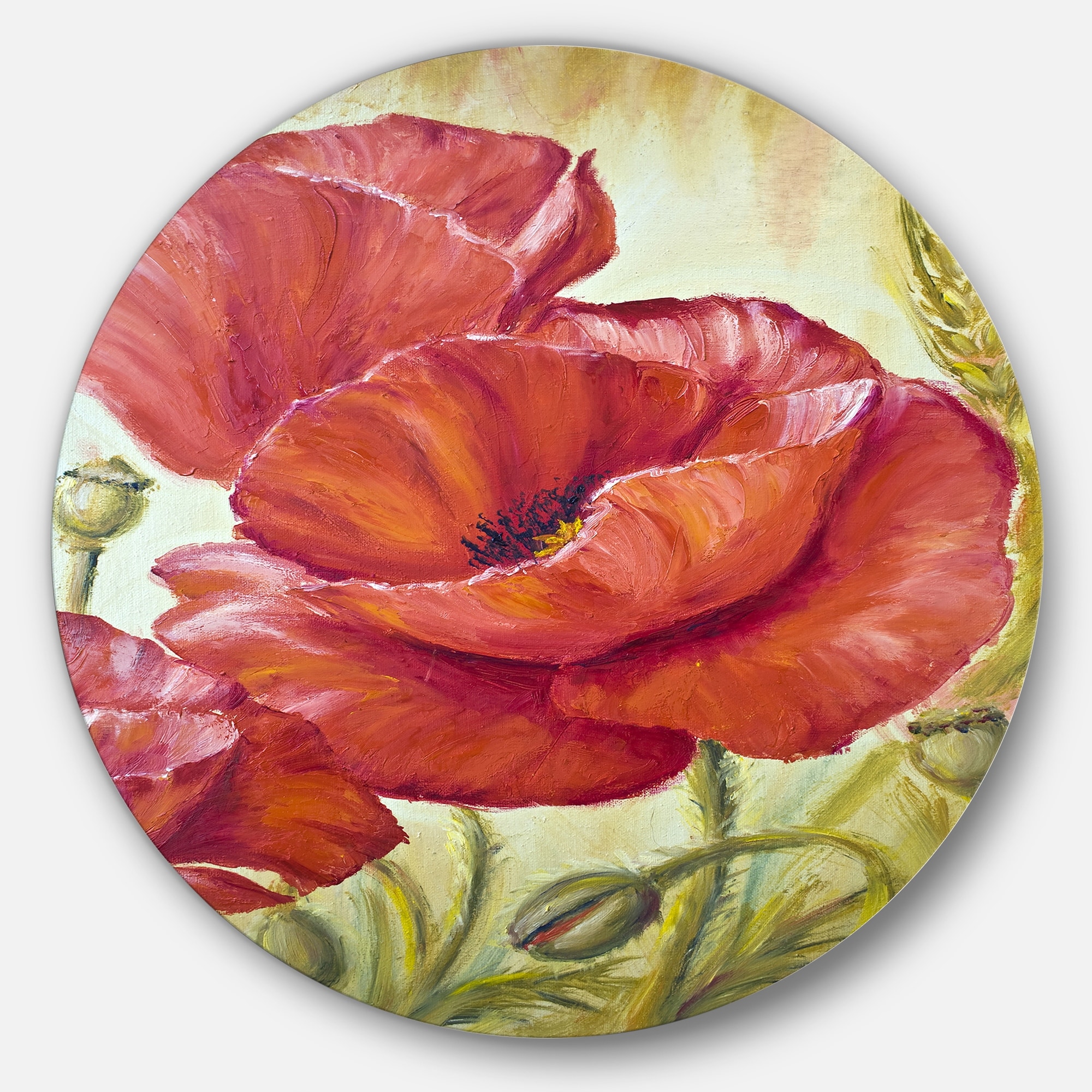 Designart 'Poppies in Wheat' Floral Glossy Large Disk Metal Wall Art