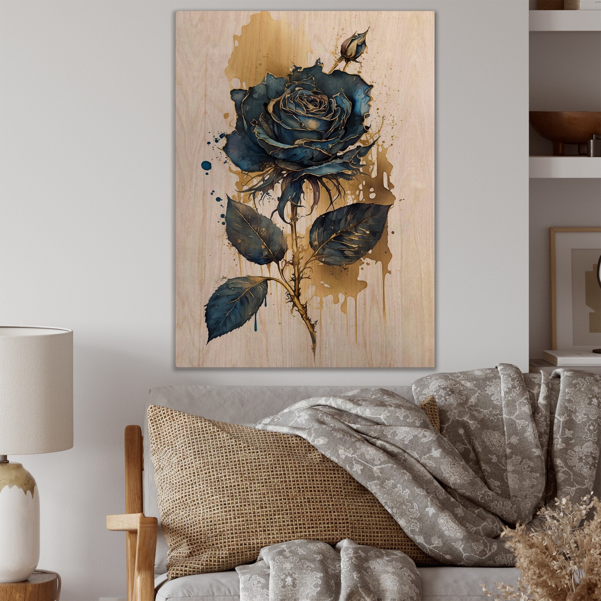 Designart 'Blue And Gold Painted Rose on White II' Floral Rose Wood Wall Art - Natural Pine Wood