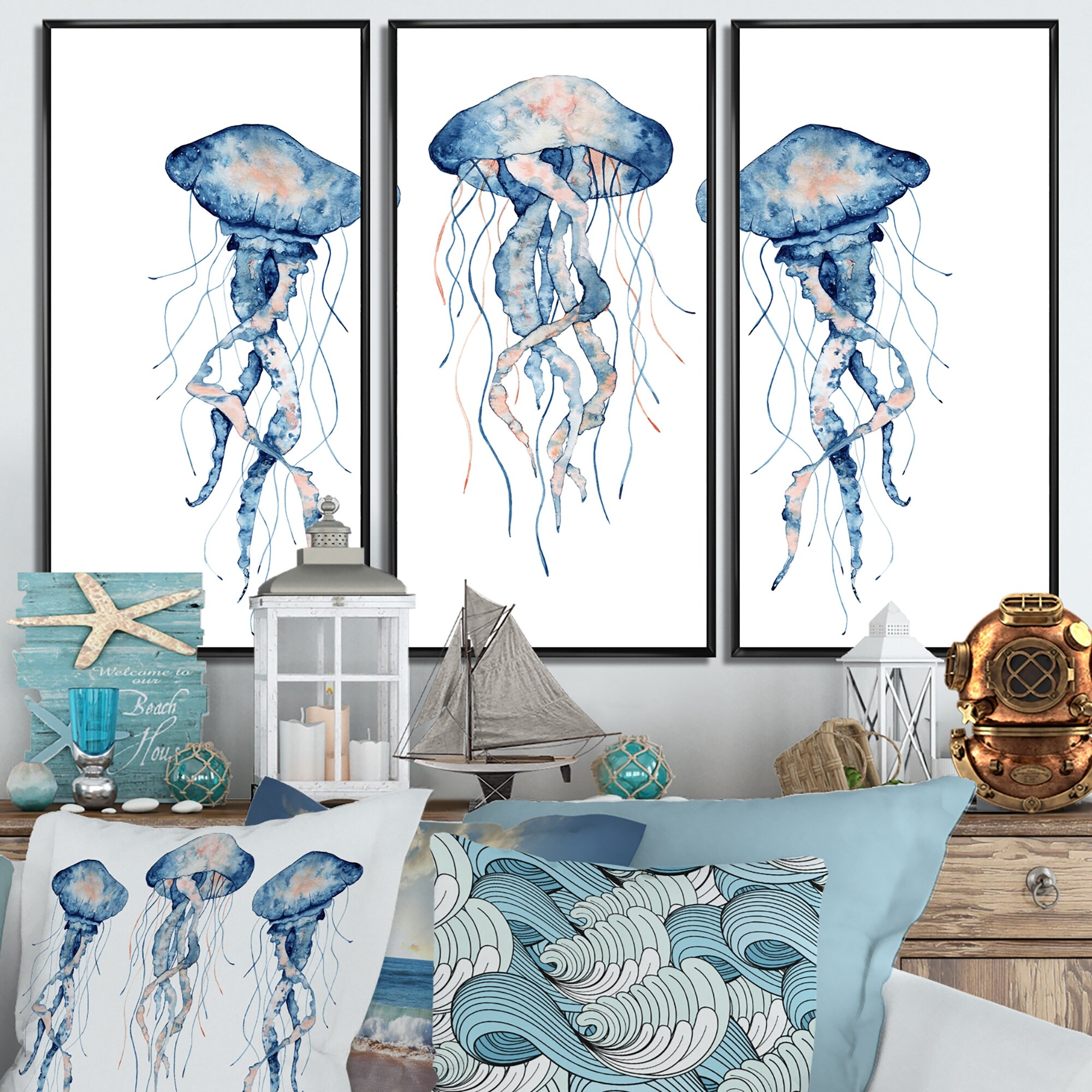 Designart "Painted Medusa on White II" Nautical & Coastal Framed Artwork Set of 3 - 4 Colors of Frames