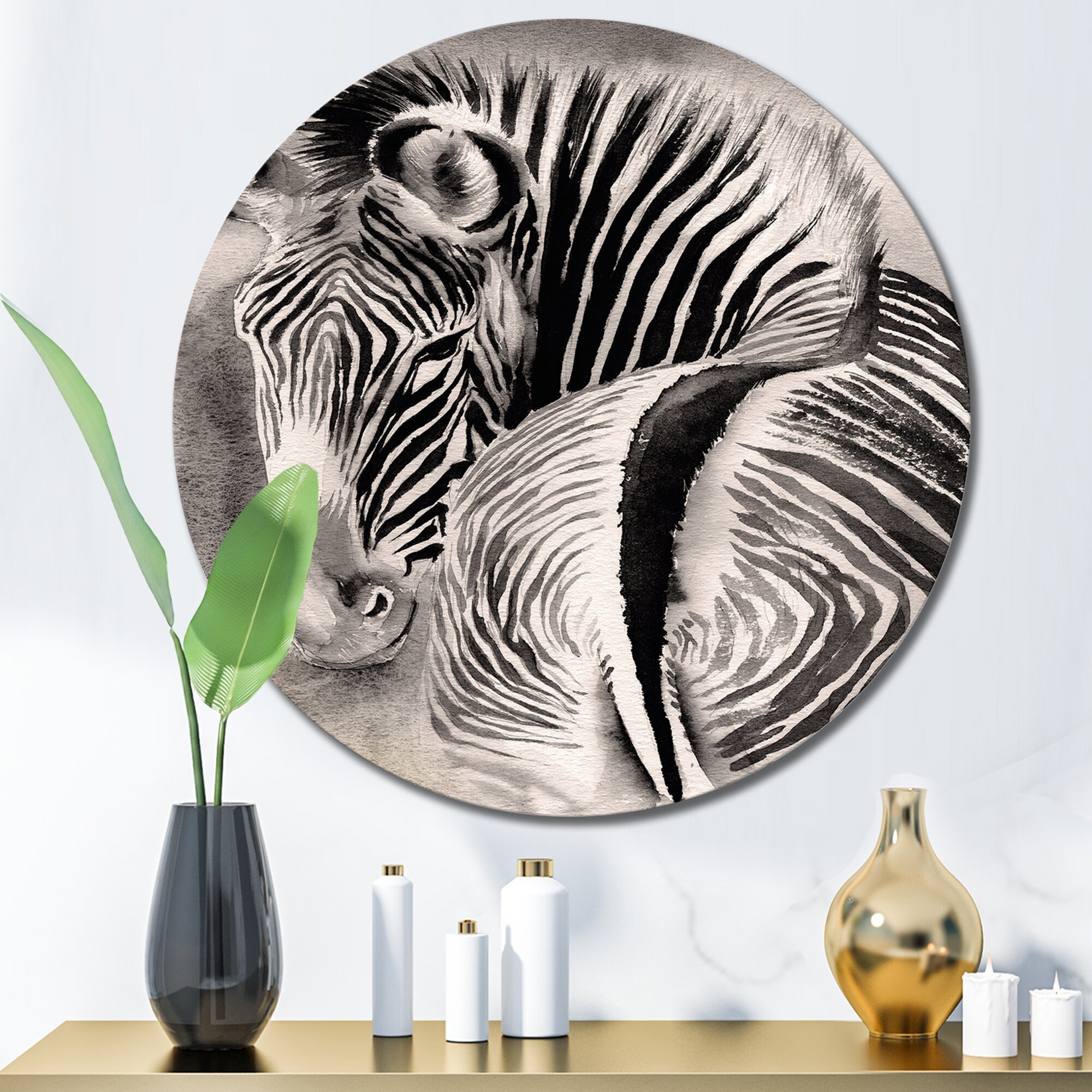 Designart 'Zebra With Contrasting Black And White Stripes IV' Traditional Metal Circle Wall Art