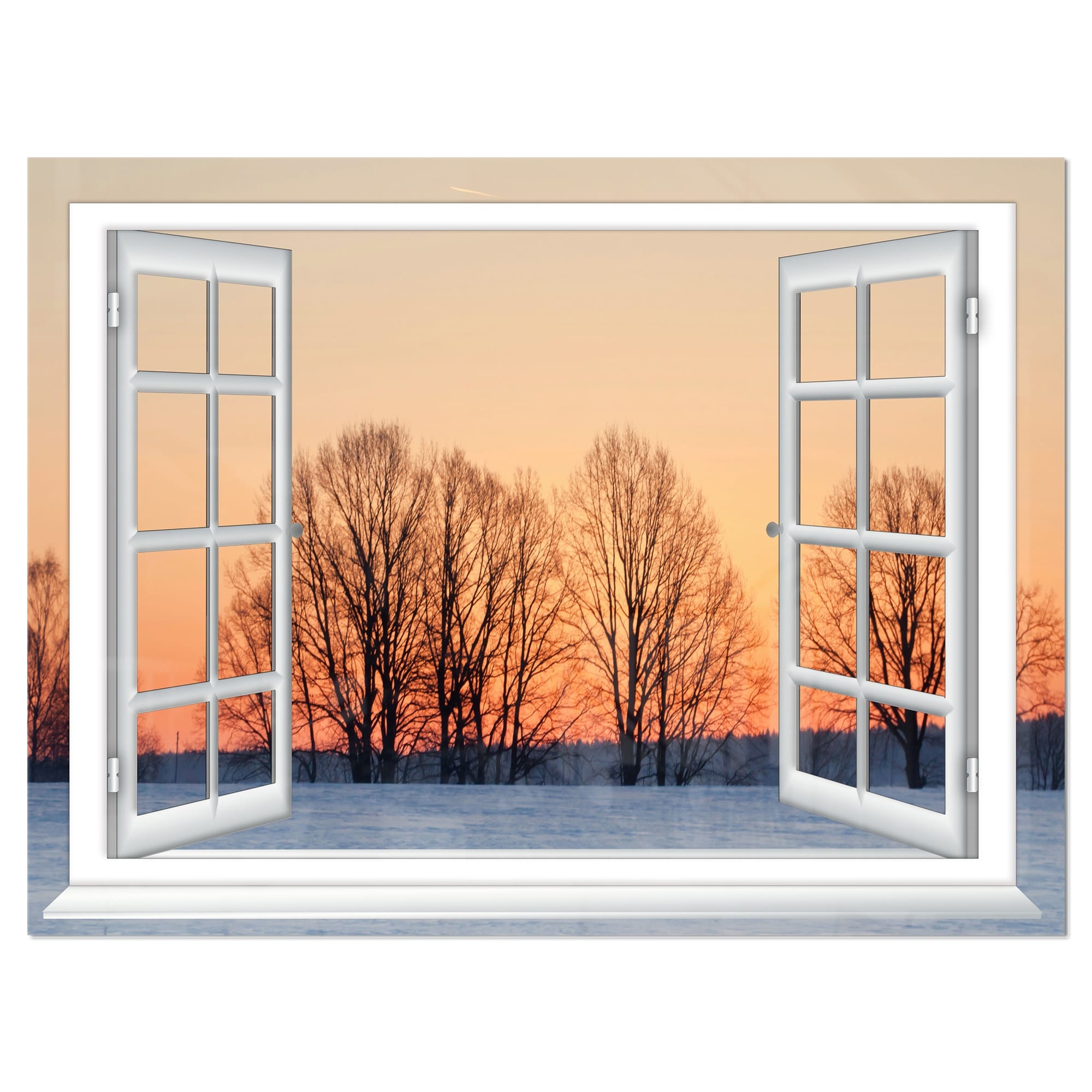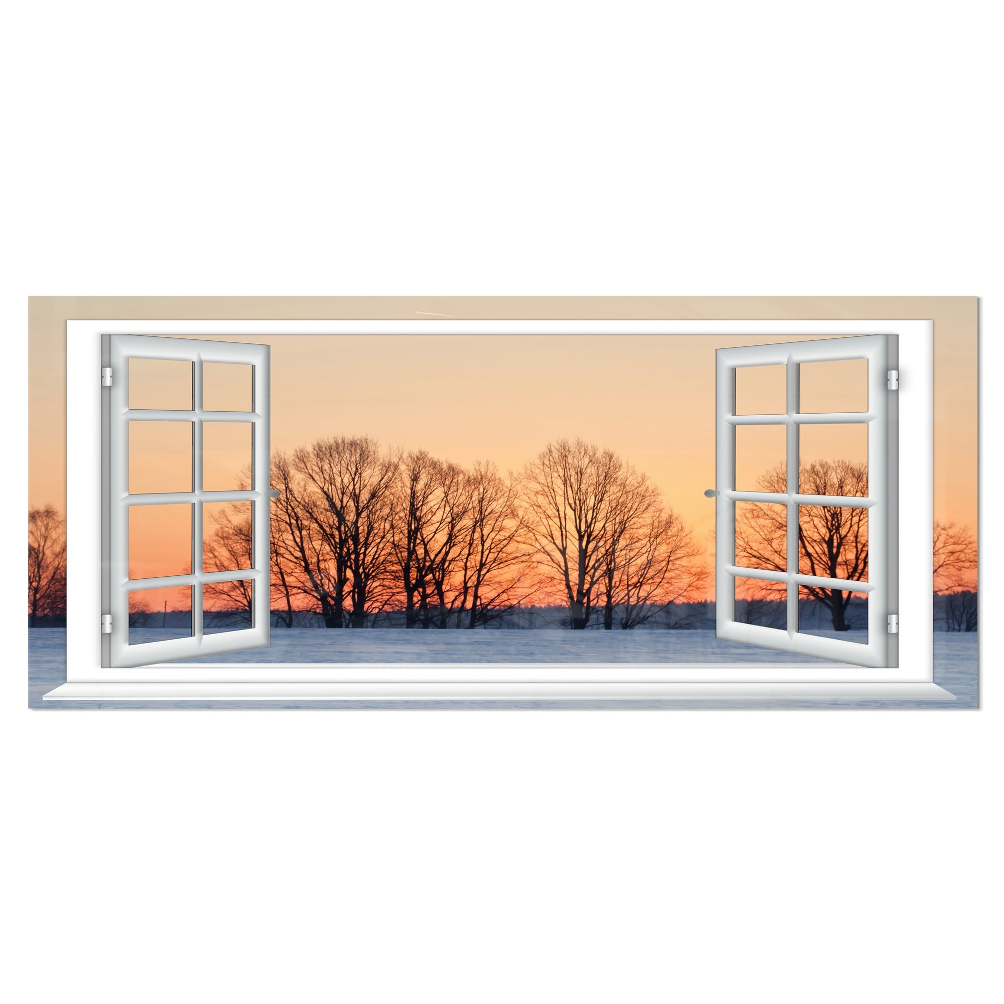 Open Window to Snowy Sunset - Landscape Glossy Metal Wall Art
