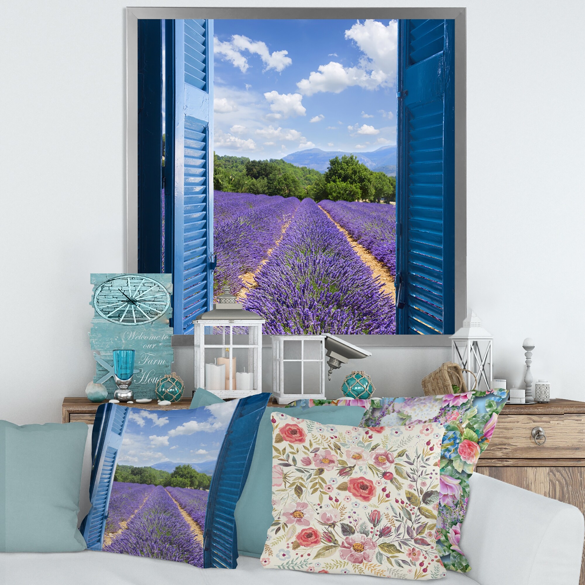 Designart "Lavender Field Through Blue Open Cottage Window" Farmhouse Framed Canvas Wall Art Print