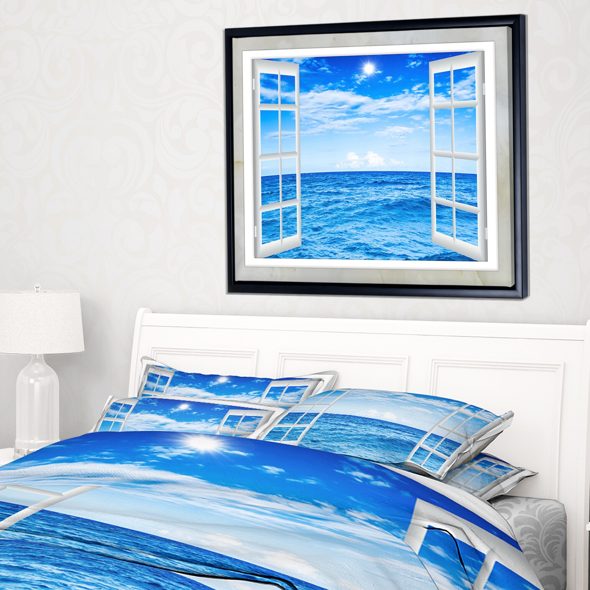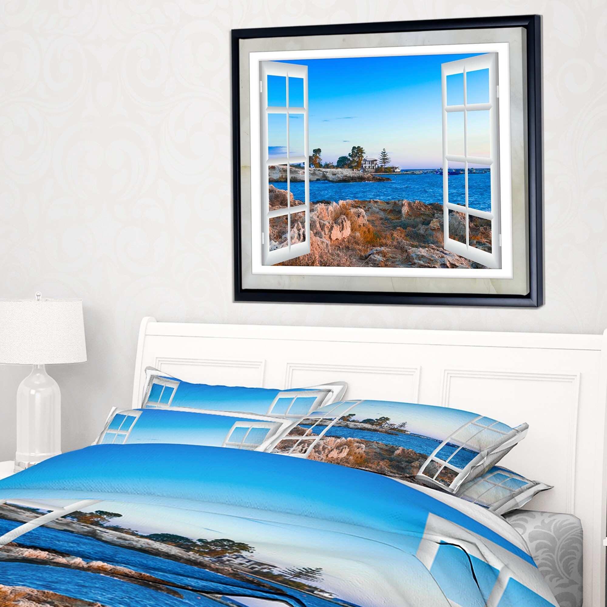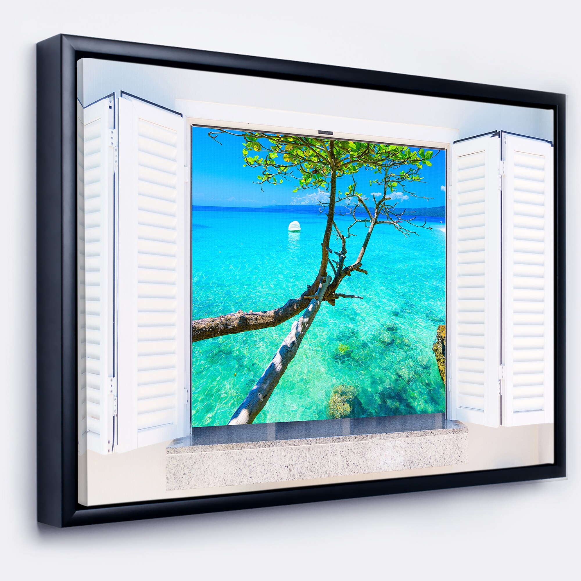 Designart "Open Window to Blue Seashore" Landscape Framed Canvas Art