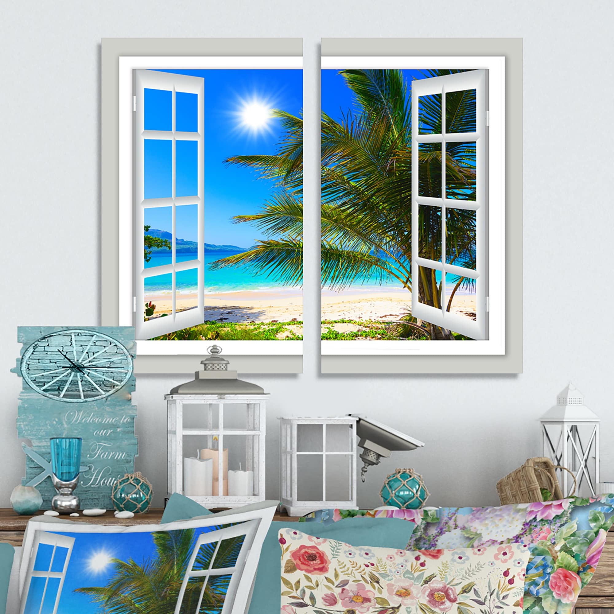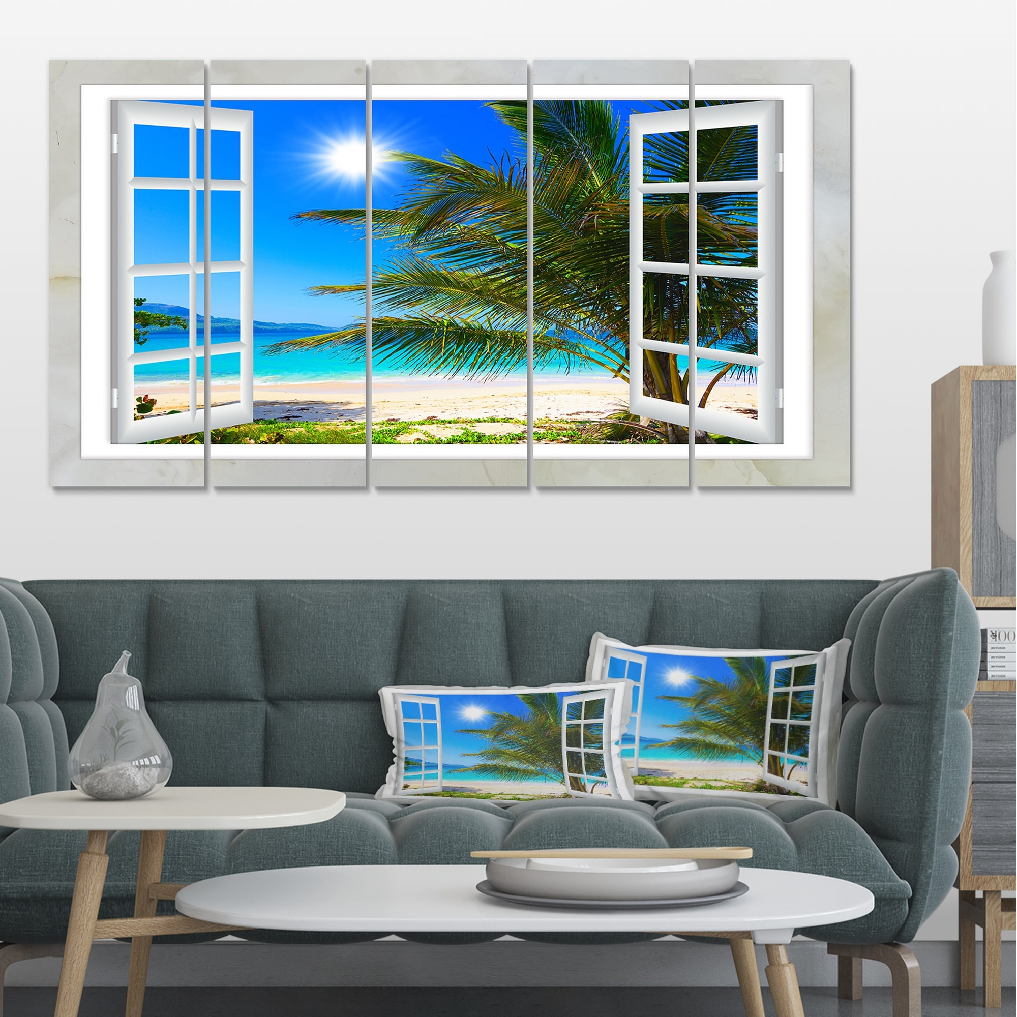 Designart "Window Open to Beach with Palm" Seashore Canvas Wall Art Print 2 Piece Set