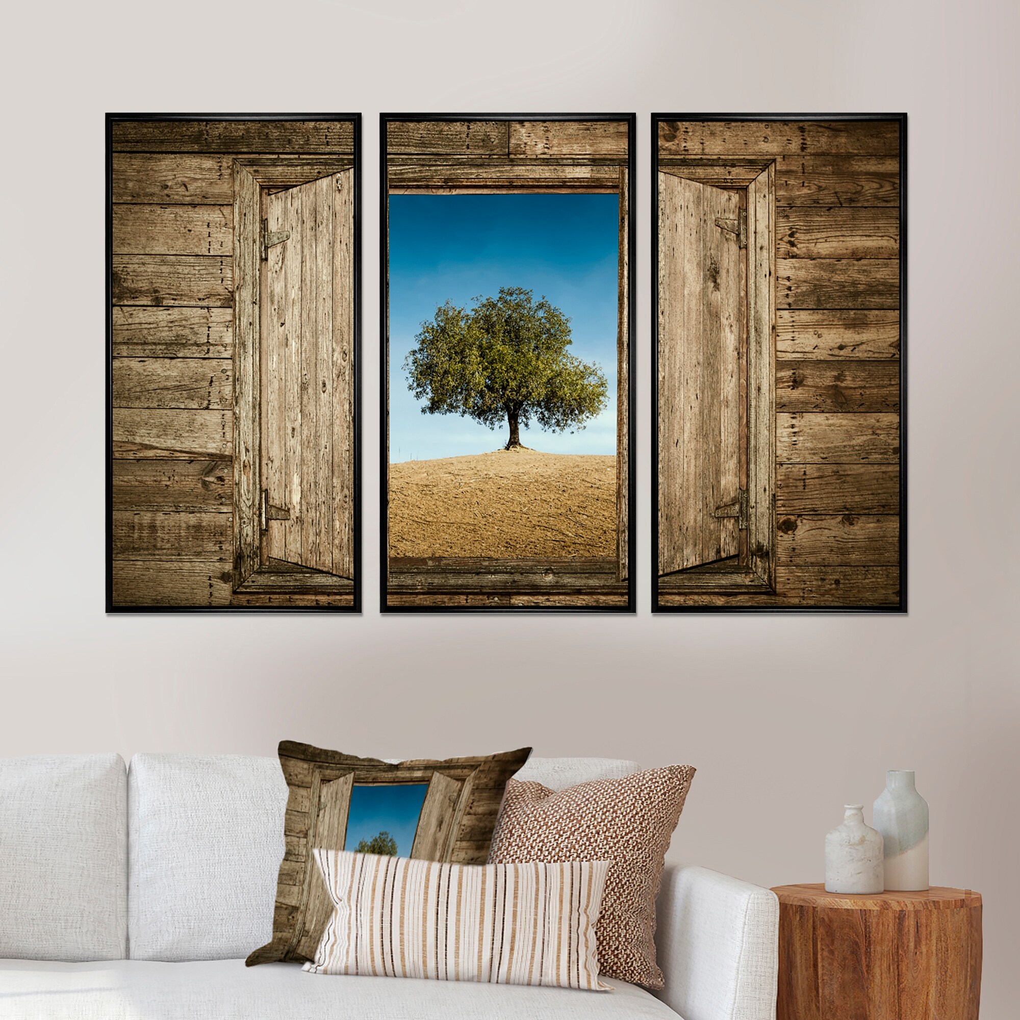 Designart "Window Open to Solitary Tree" Landscape Framed Canvas Wall Art Set of 3 - 4 Colors of Frames