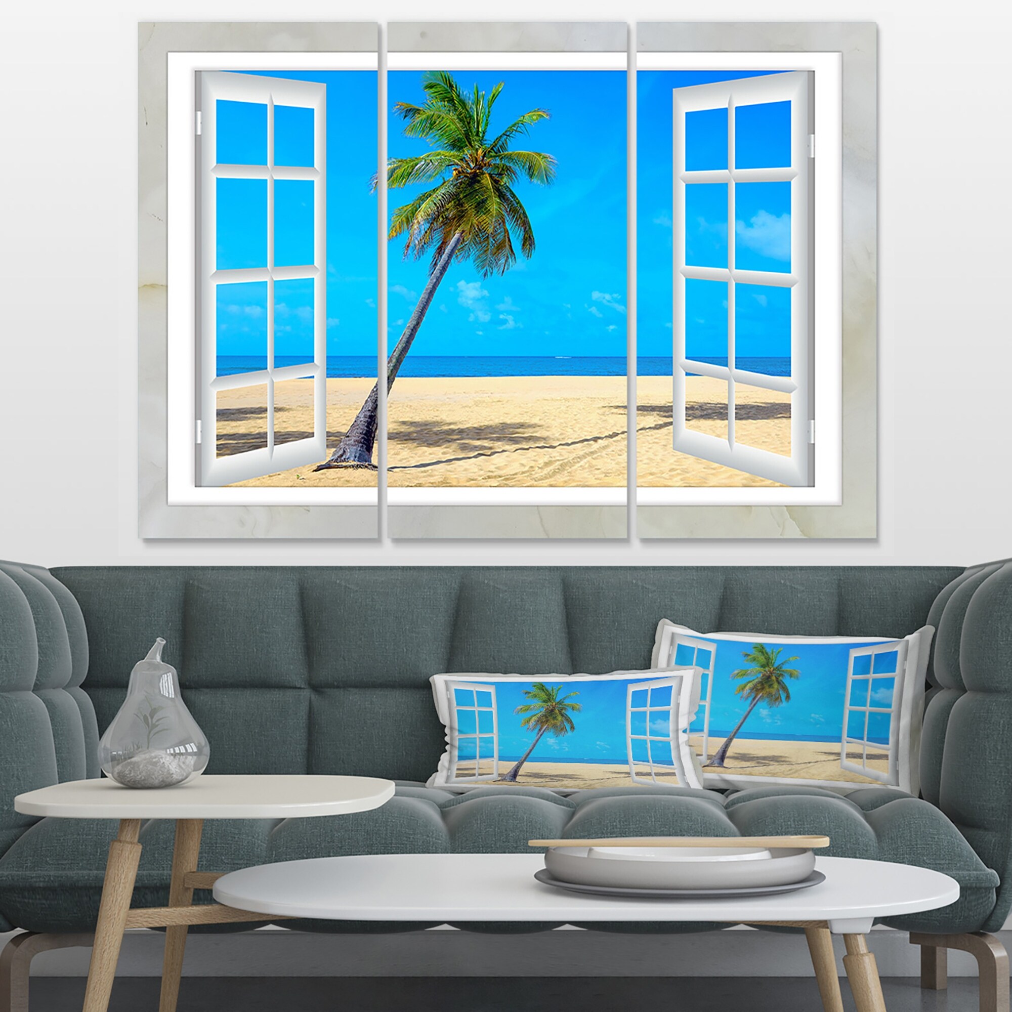 Designart "Open Window to Beach with Palm" Extra Large Seashore Canvas Art - 36x28 - 3 Panels