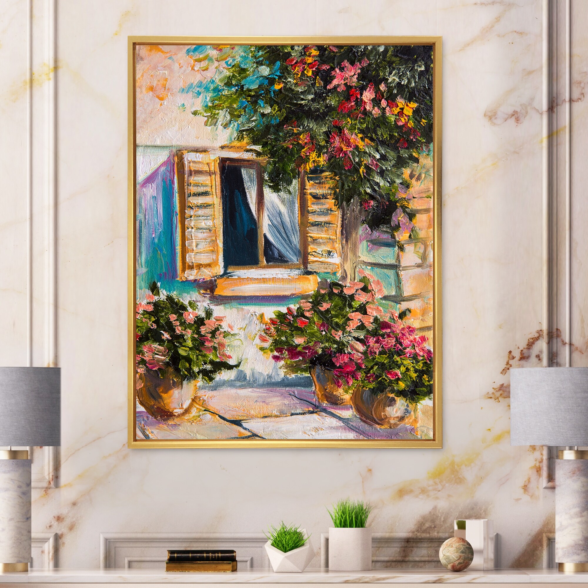 Designart "Open Window With Vibrant Flowers in Greek Street" Colonial Framed Canvas Wall Art Print