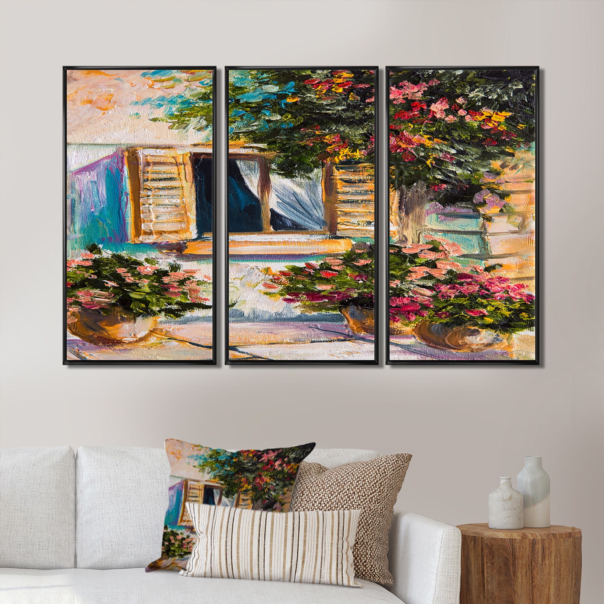 Designart "Open Window With Vibrant Flowers in Greek Street" Colonial Framed Canvas Wall Art Print Set of 3 - 4 Colors of Frames