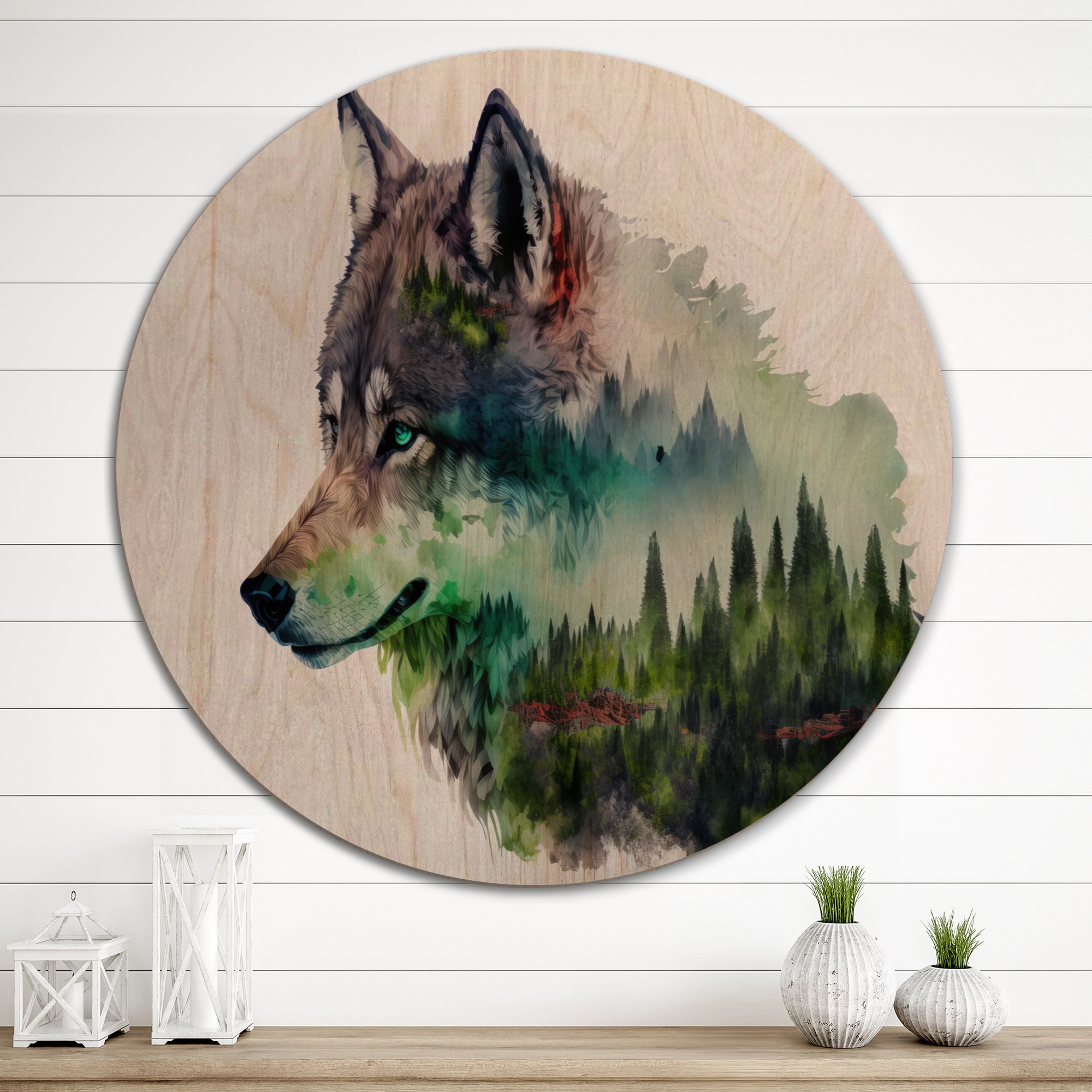 Designart "Double Exposure of a Wolf With Forest Landscape " Modern Wood Wall Art - Natural Pine Wood