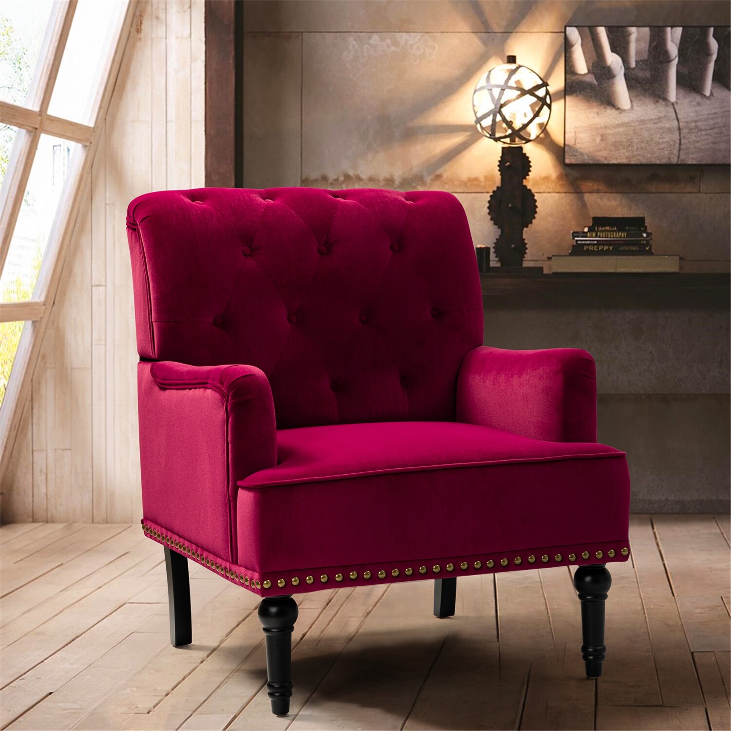 Geltrude Transitional Upholstered Button Tufted Club Chair with turned wooden Legs by HULALA HOME