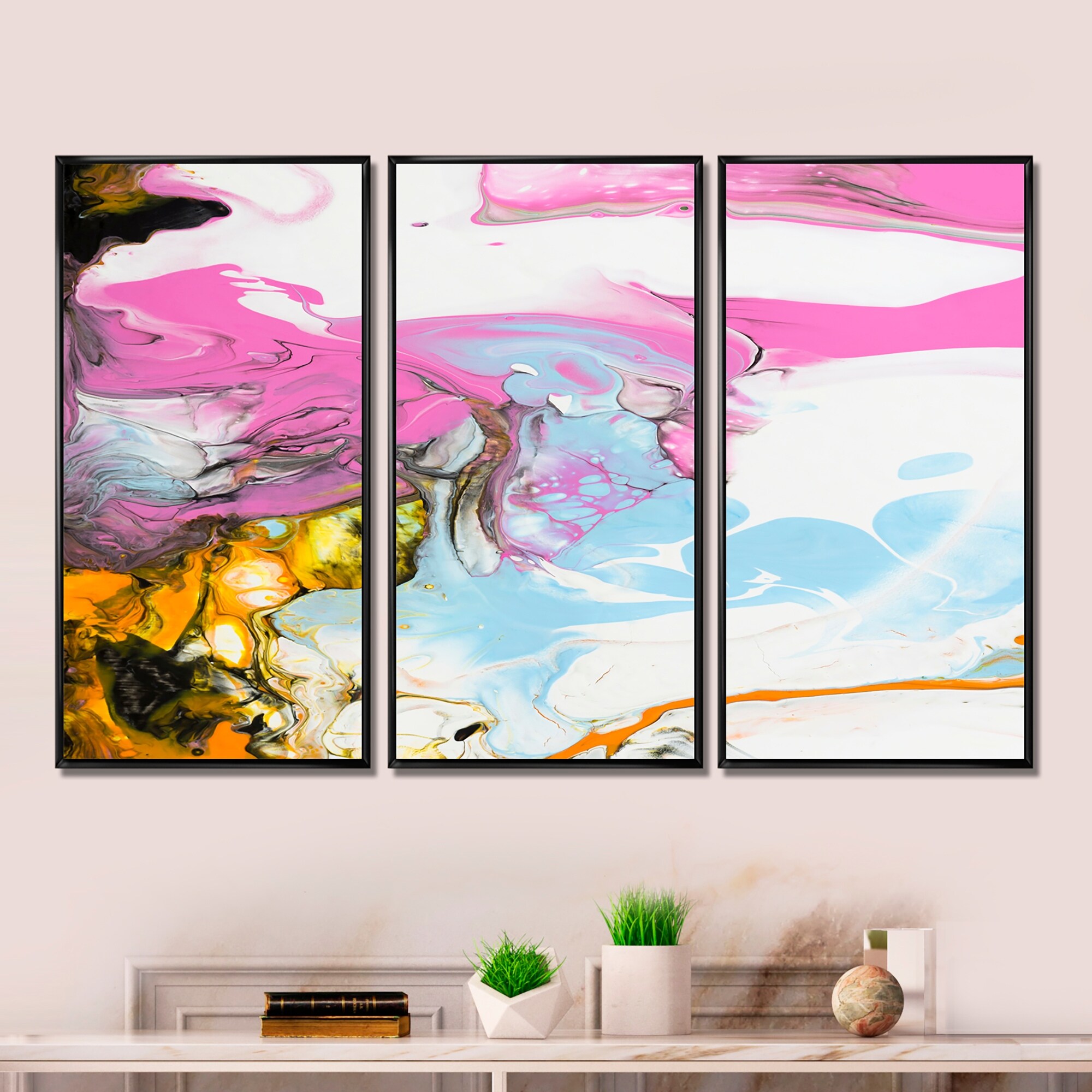Designart "Pink Blue And Yellow Liquid Art II" Modern Framed Art Set of 3 - 4 Colors of Frames