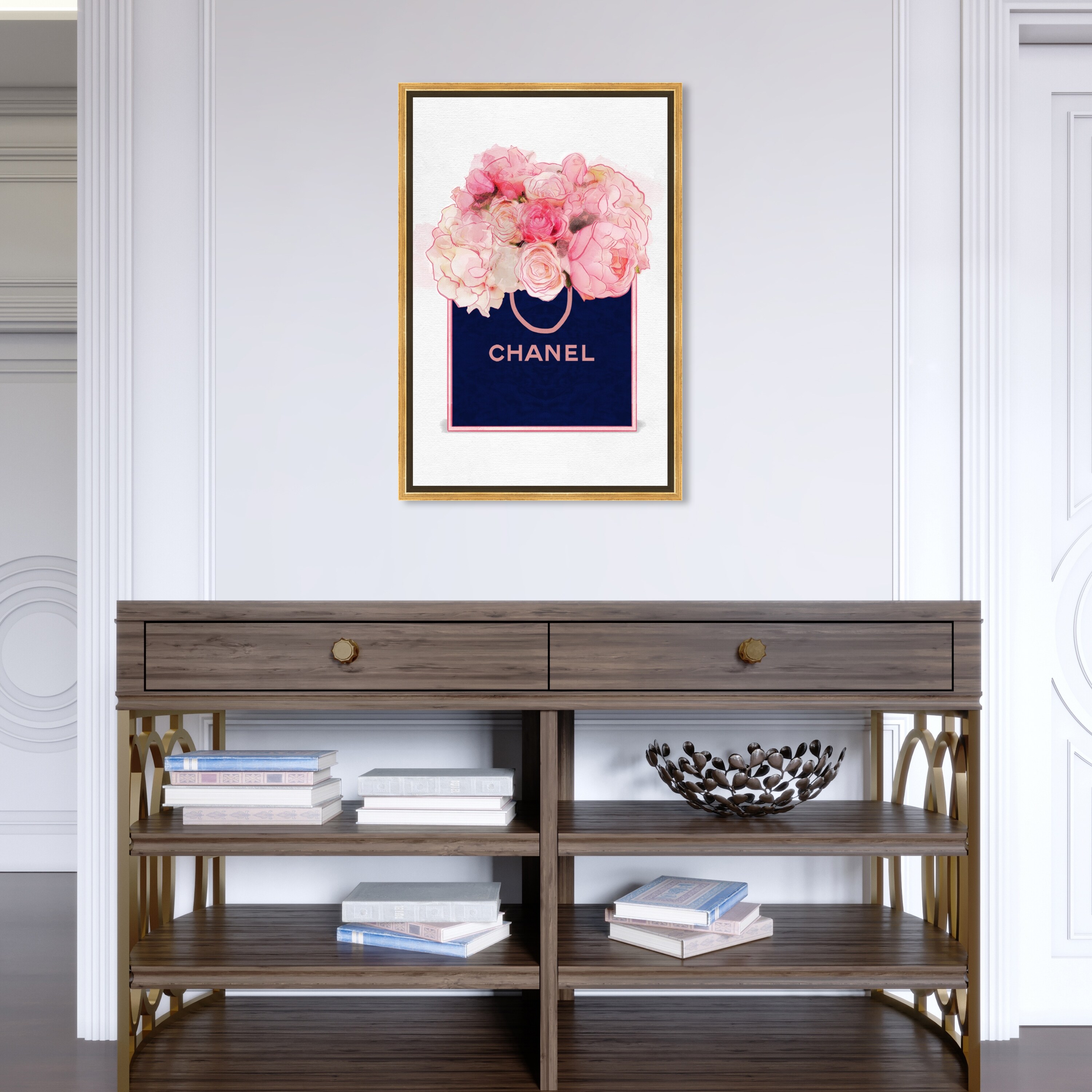 Oliver Gal 'Flower Bag Flocked' Fashion and Glam Wall Art Framed Canvas Print Lifestyle - Blue, Pink