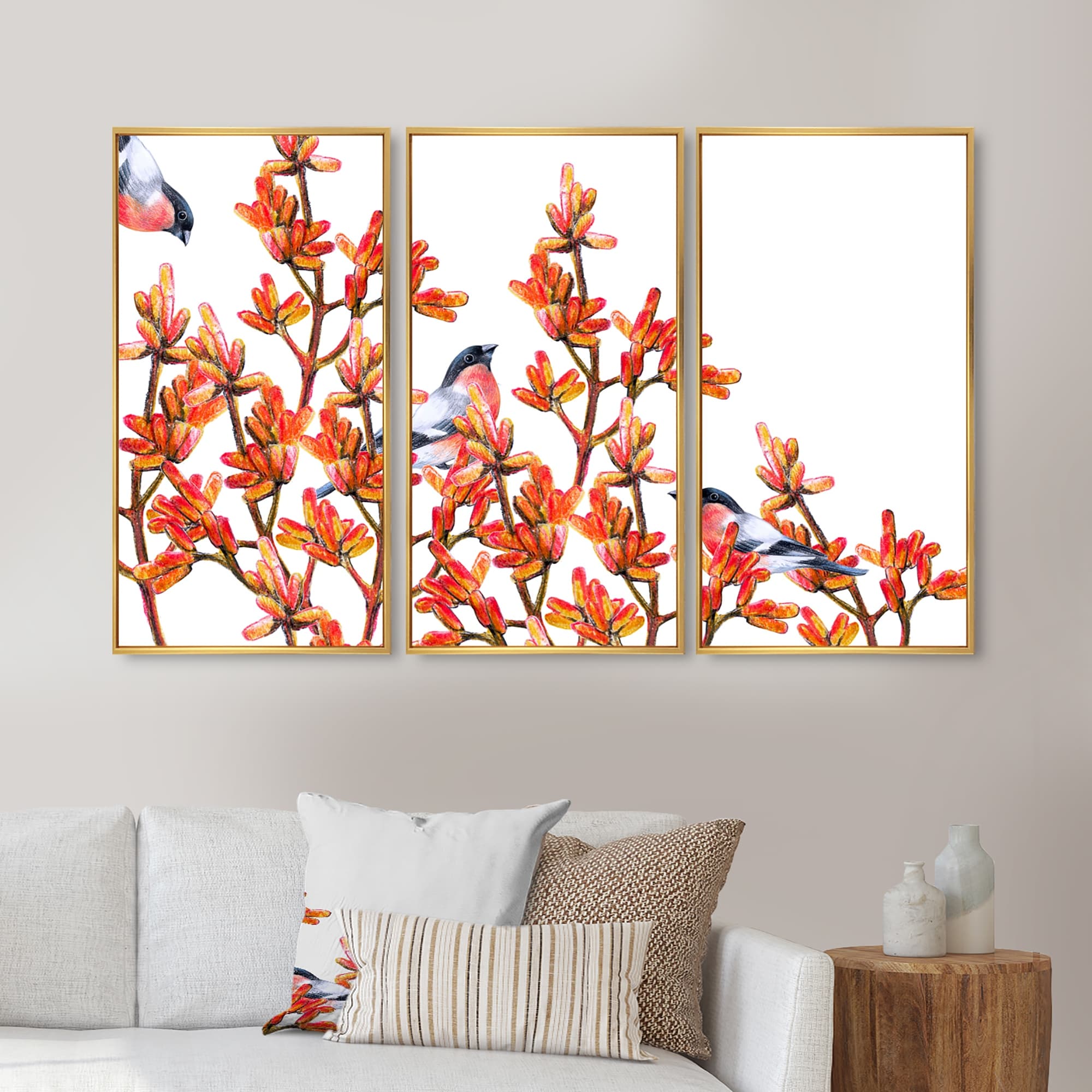 Designart "Flock of Bullfinches Birds on Orange Branches" Traditional Framed Canvas Wall Art Set of 3 - 4 Colors of Frames